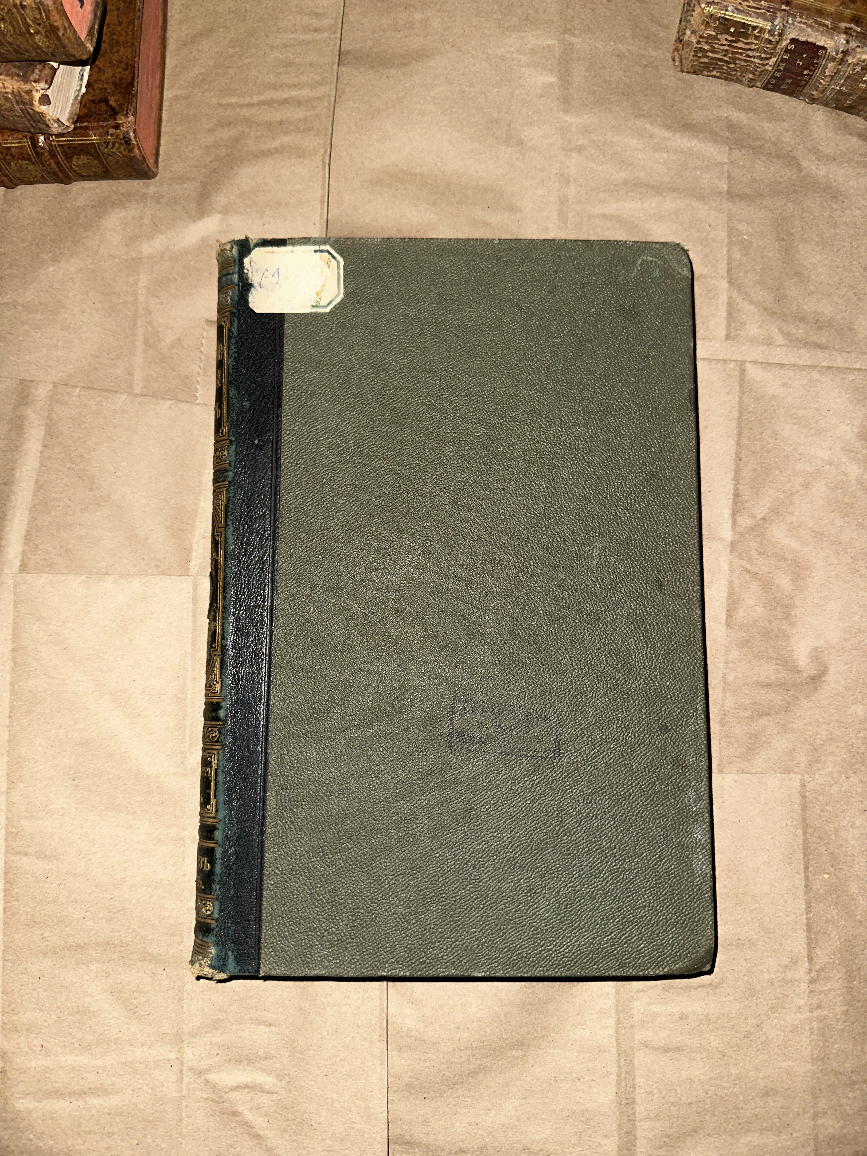 Вид сверху на антикварную книгу с зелеными фактурными крышками и темным кожаным корешком с золотым тиснением.