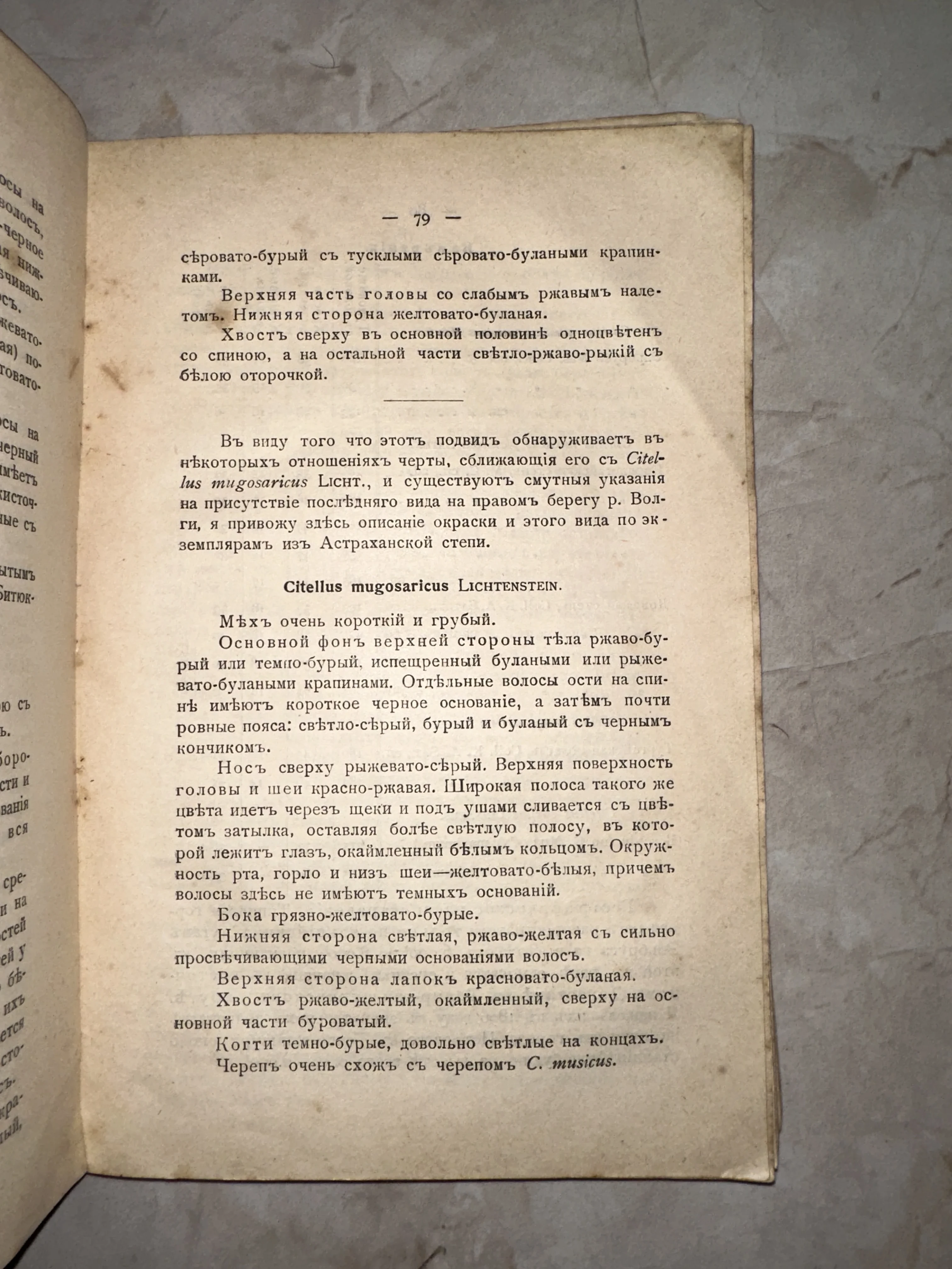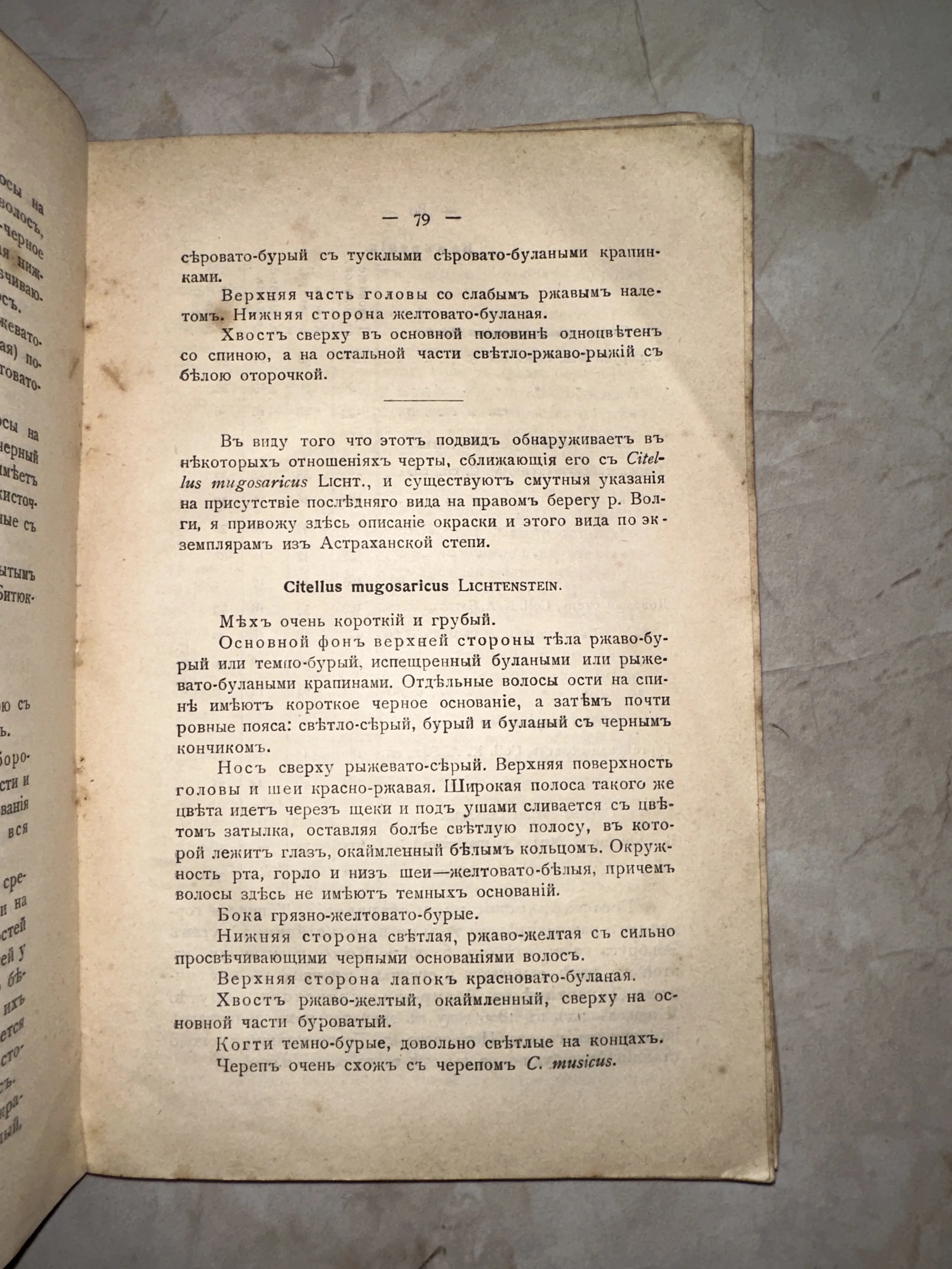 Перед вами подлинный фрагмент зоологического исследования, напечатанный с использованием дореформенной орфографии. Пожелтевшая бумага с легкой патиной времени и характерными пятнышками хранит детальное описание степного суслика, возвращая нас в эпоху великих натуралистов. Этот артефакт станет ценным дополнением коллекции антикварной букинистики или декоративным элементом в классическом интерьере.