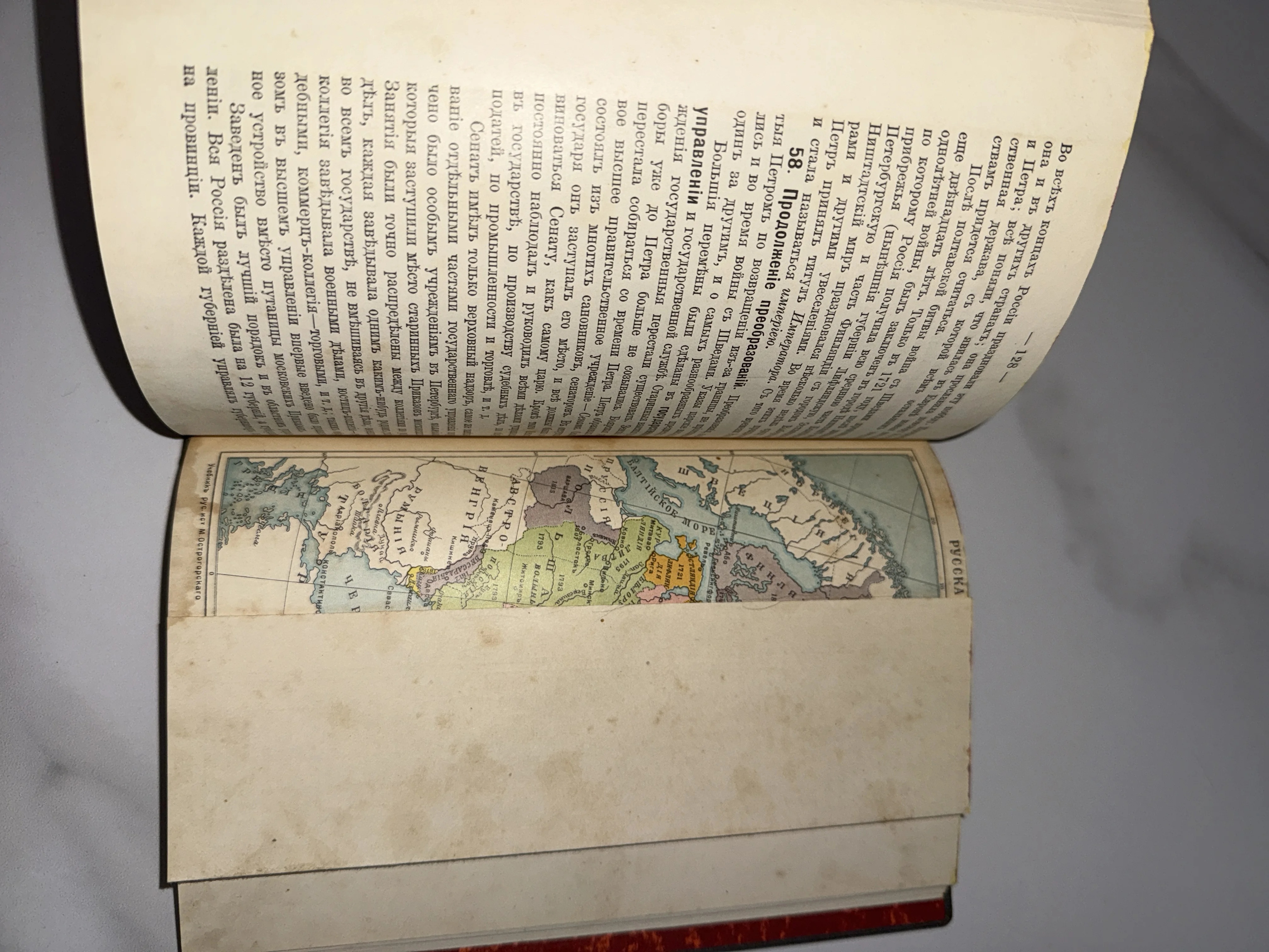 Разворот антикварной книги с текстом на дореволюционном русском языке и цветной складной картой Европы.