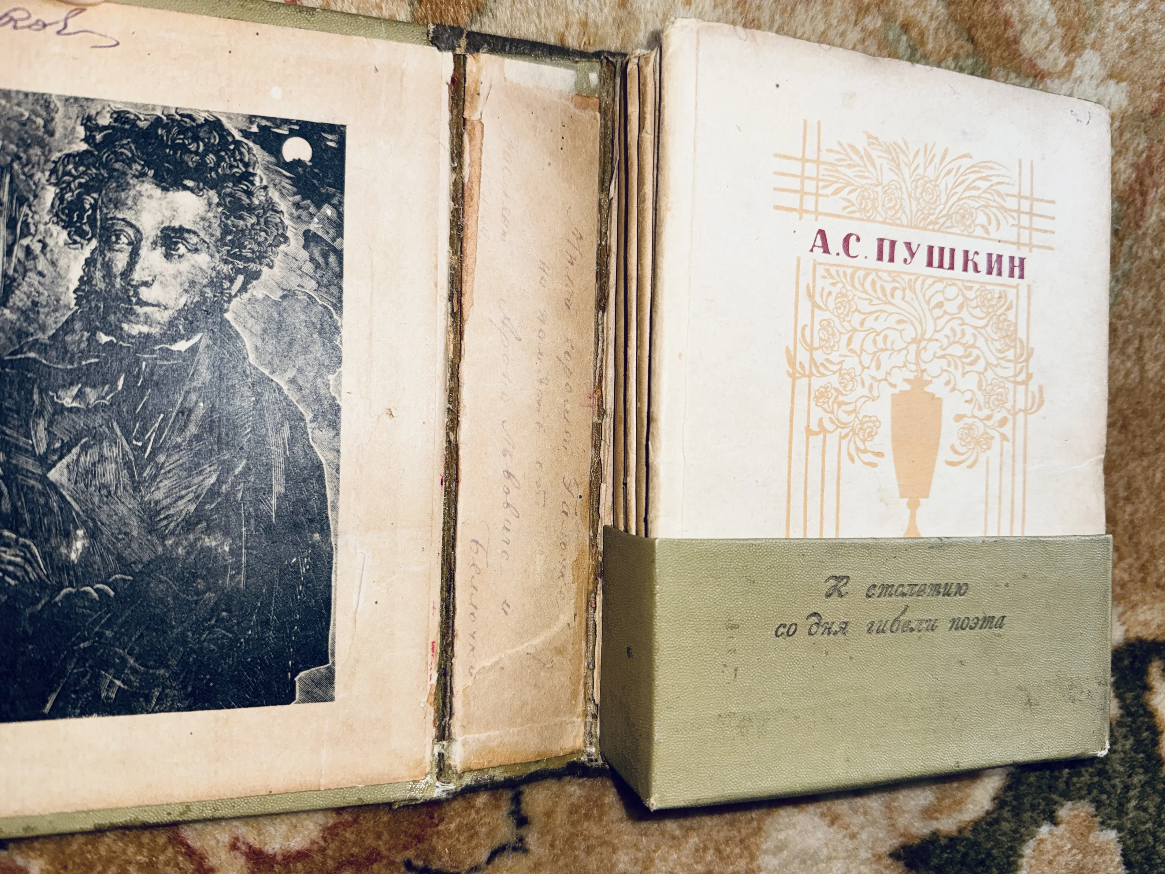 Уникальное памятное издание 1937 года, приуроченное к вековому юбилею памяти великого русского поэта. На развороте представлен классический гравированный портрет и титульный лист в оригинальном футляре, сохранившем благородную патину времени. Коллекционный интерес представляют рукописные пометки на корешке, свидетельствующие о живой истории этого экземпляра в частных библиотеках.