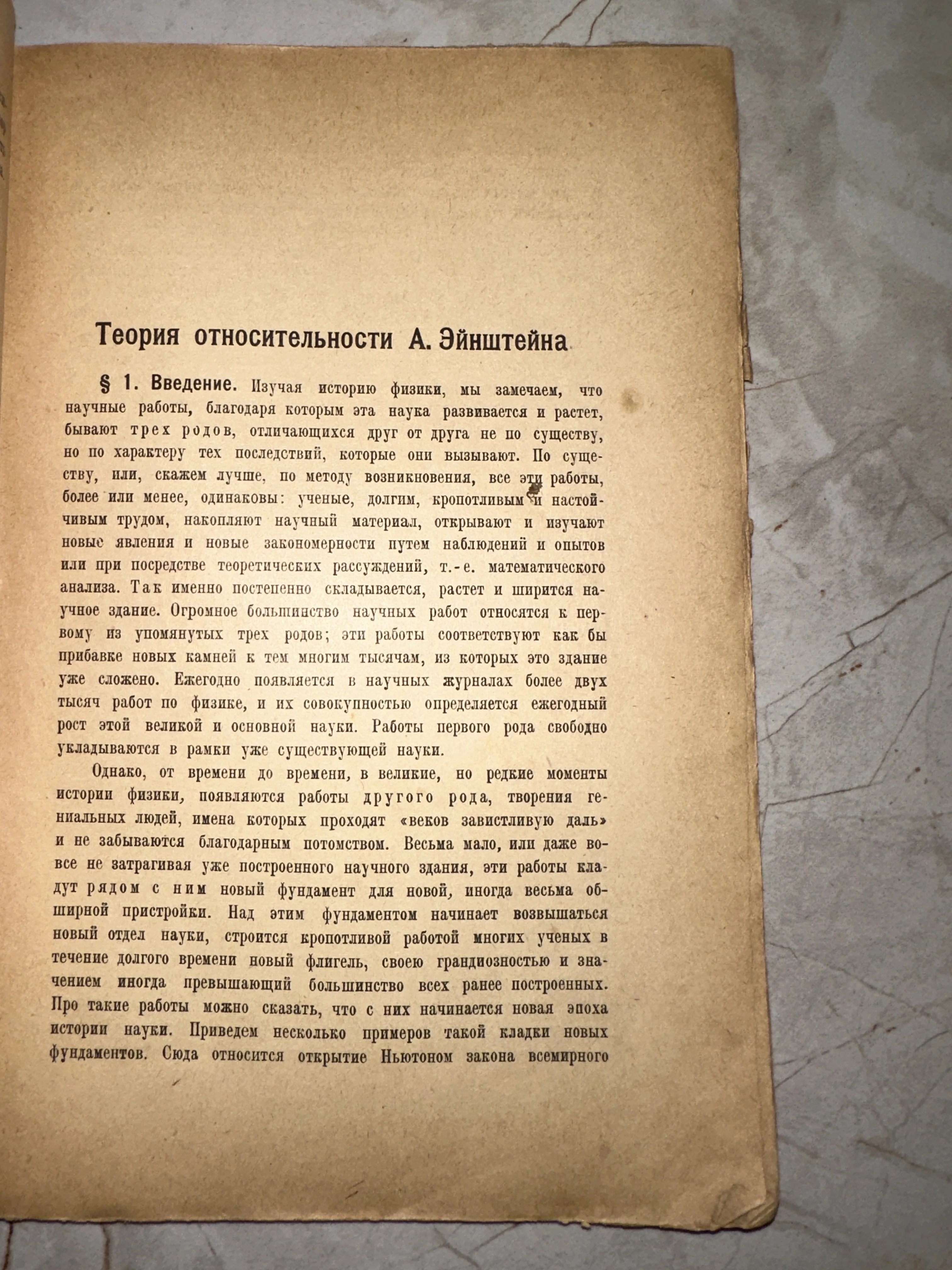 Перед вами подлинный артефакт из мира большой науки — редкое изложение теории относительности, запечатленное на страницах старого издания. Характерный шрифт начала XX века и благородная патина времени на бумаге подчеркивают историческую значимость текста, ознаменовавшего революцию в физике. Этот экземпляр станет ценным приобретением для коллекционера научной литературы или исследователя истории великих открытий.