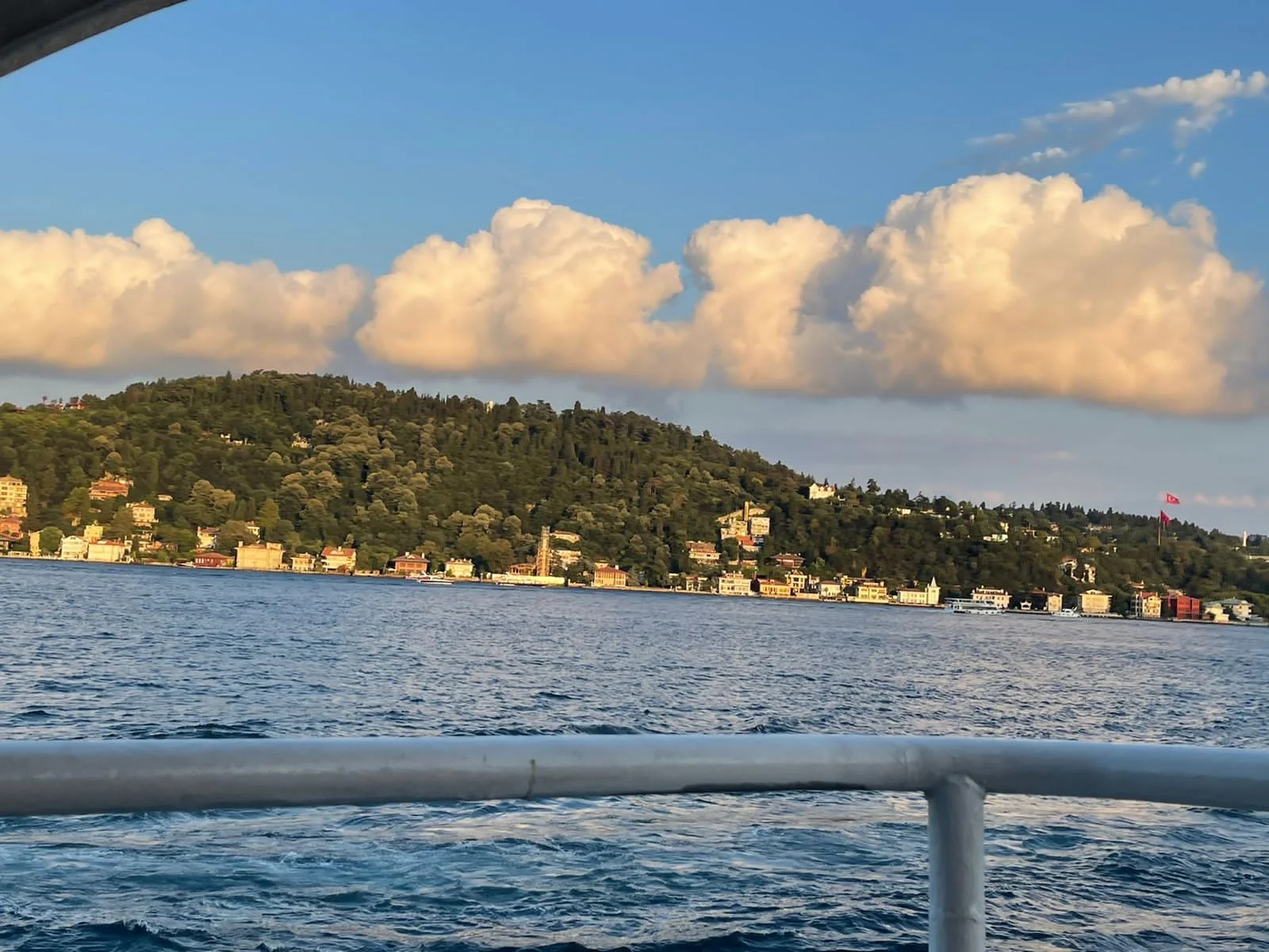 Живописный вид на прибрежную архитектуру, утопающую в зелени холмов под величественным небом. Золотистый свет заходящего солнца подчеркивает фактуру облаков и создает атмосферу спокойного путешествия по легендарному проливу. Снимок идеально передает очарование старого города, где история встречается с морской стихией.