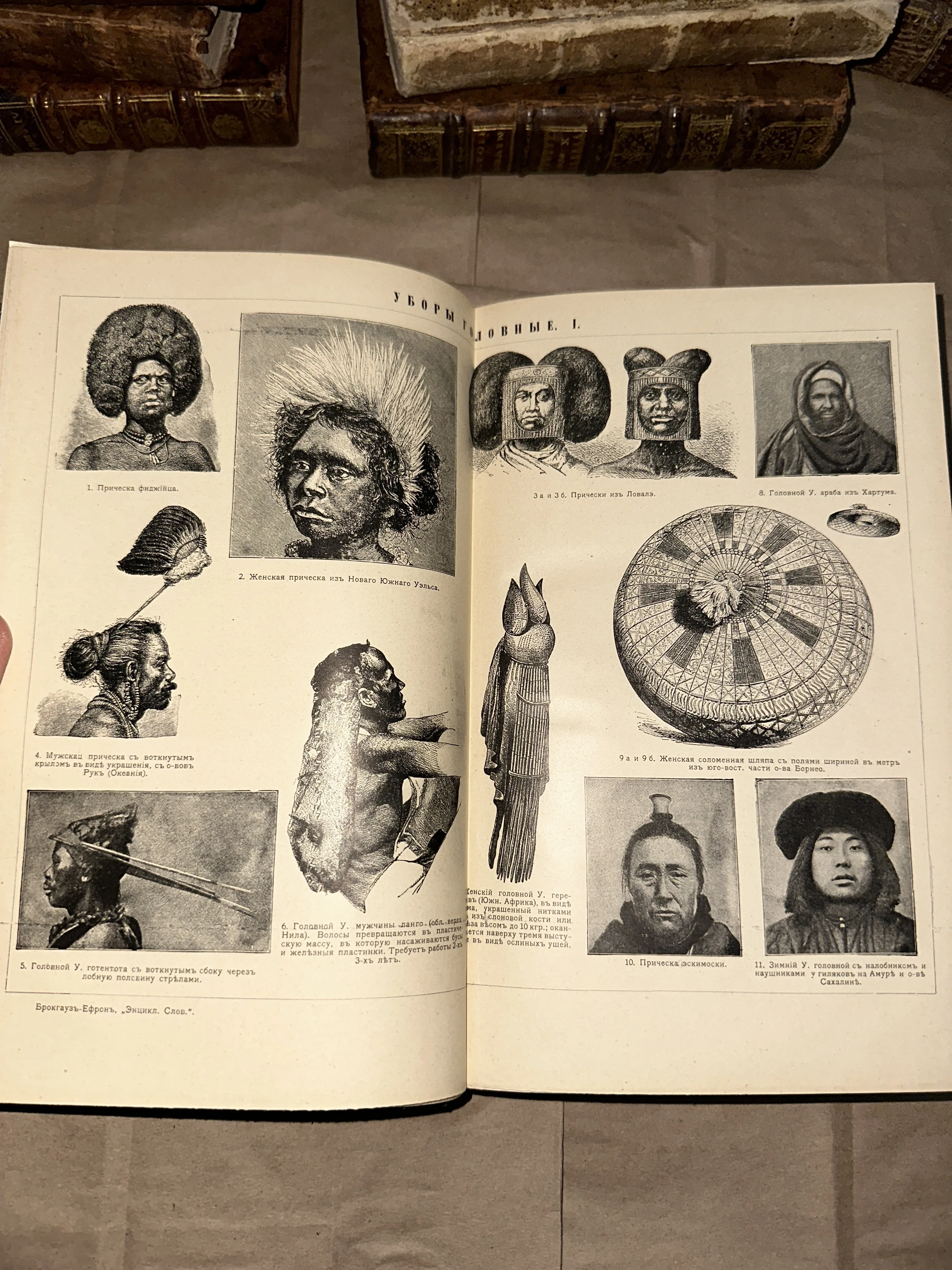 Разворот антикварной книги с черно-белыми иллюстрациями этнических причесок и головных уборов разных народов мира.