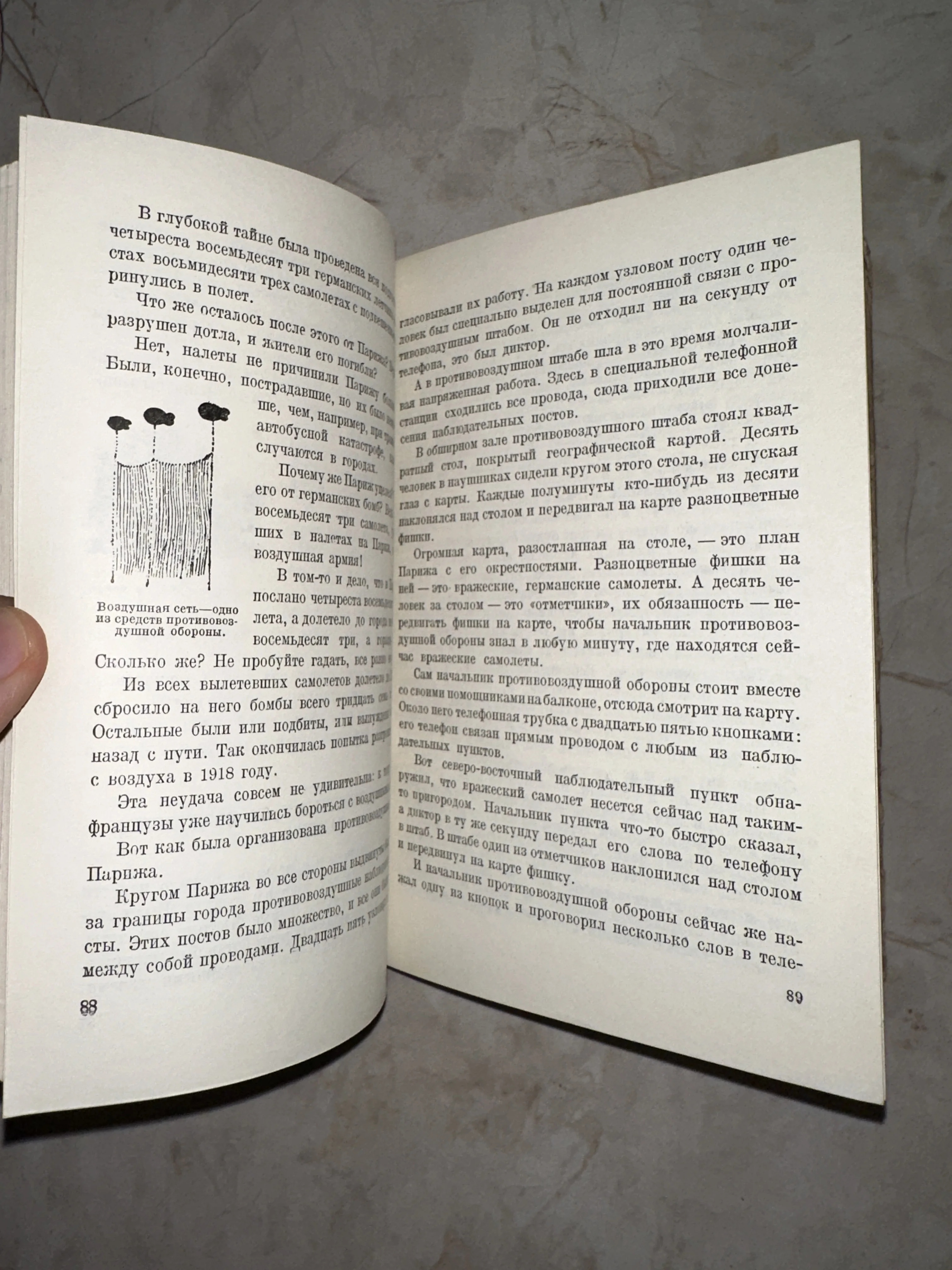 Перед вами живое свидетельство эпохи — страницы антикварного издания, подробно описывающего тактику защиты Парижа от вражеских налетов в годы Первой мировой войны. Текст сопровожден редкой схематичной иллюстрацией «воздушной сети», а пожелтевшая бумага и характерный шрифт создают неповторимую атмосферу исторического документа. Издание представляет коллекционный интерес для историков авиации и любителей военной документалистики.