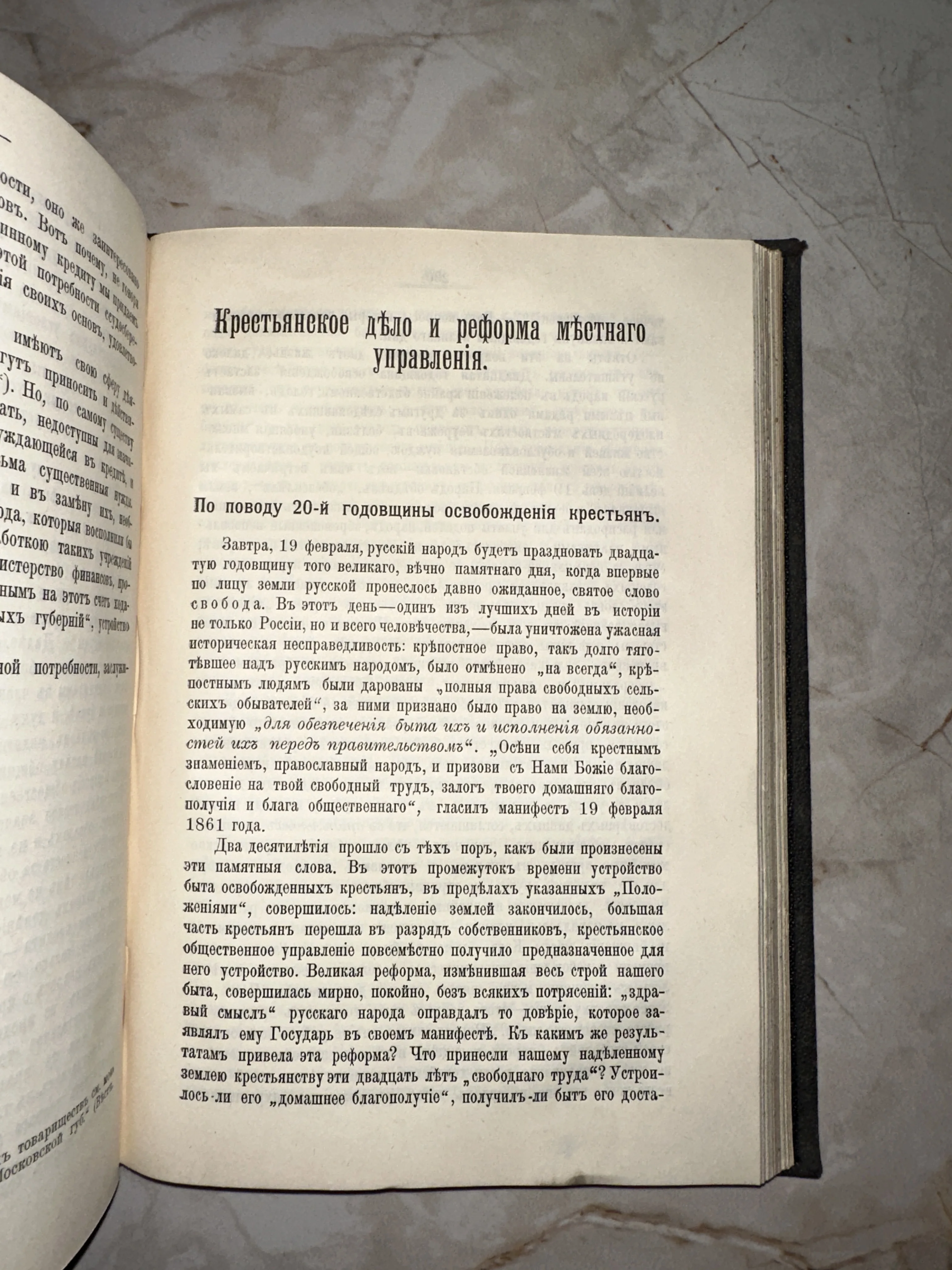 Этот редкий экземпляр, напечатанный в дореволюционной орфографии, посвящен двадцатилетию отмены крепостного права в России. Пожелтевшие страницы и четкий шрифт сохранили дух эпохи великих преобразований Александра II, представляя огромную ценность для коллекционеров и историков.