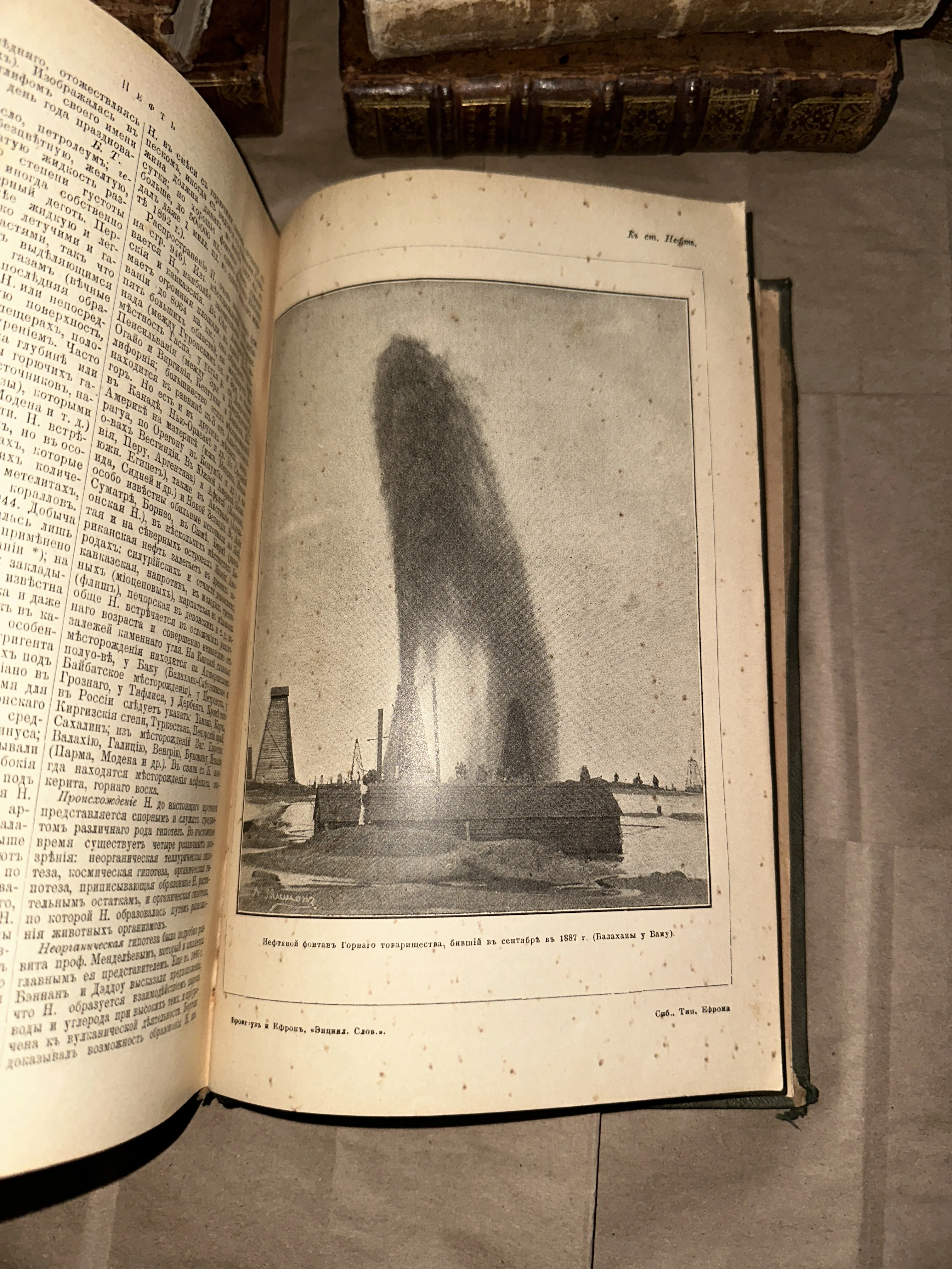 Уникальный фрагмент истории промышленности, запечатленный на страницах знаменитого энциклопедического словаря Брокгауза и Ефрона. На гравюре изображен колоссальный нефтяной фонтан в Балаханах, передающий суровую эстетику и масштаб бакинских приисков конца XIX века. Желтоватая бумага с характерным крапом времени придает этому экземпляру особую антикварную притягательность.