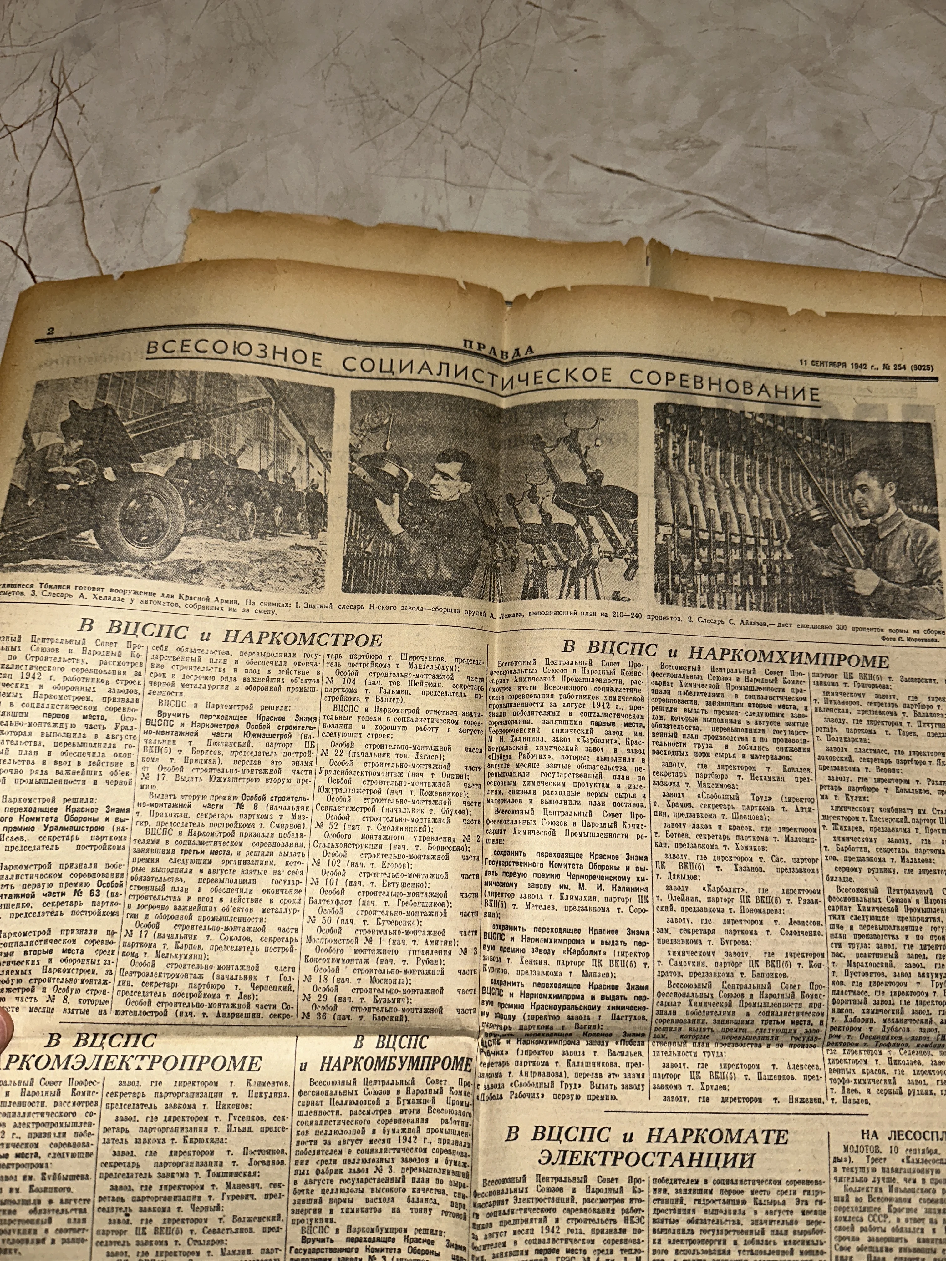 Разворот советской газеты «Правда» 1942 года с заголовком о Всесоюзном социалистическом соревновании и архивным фото рабочих.