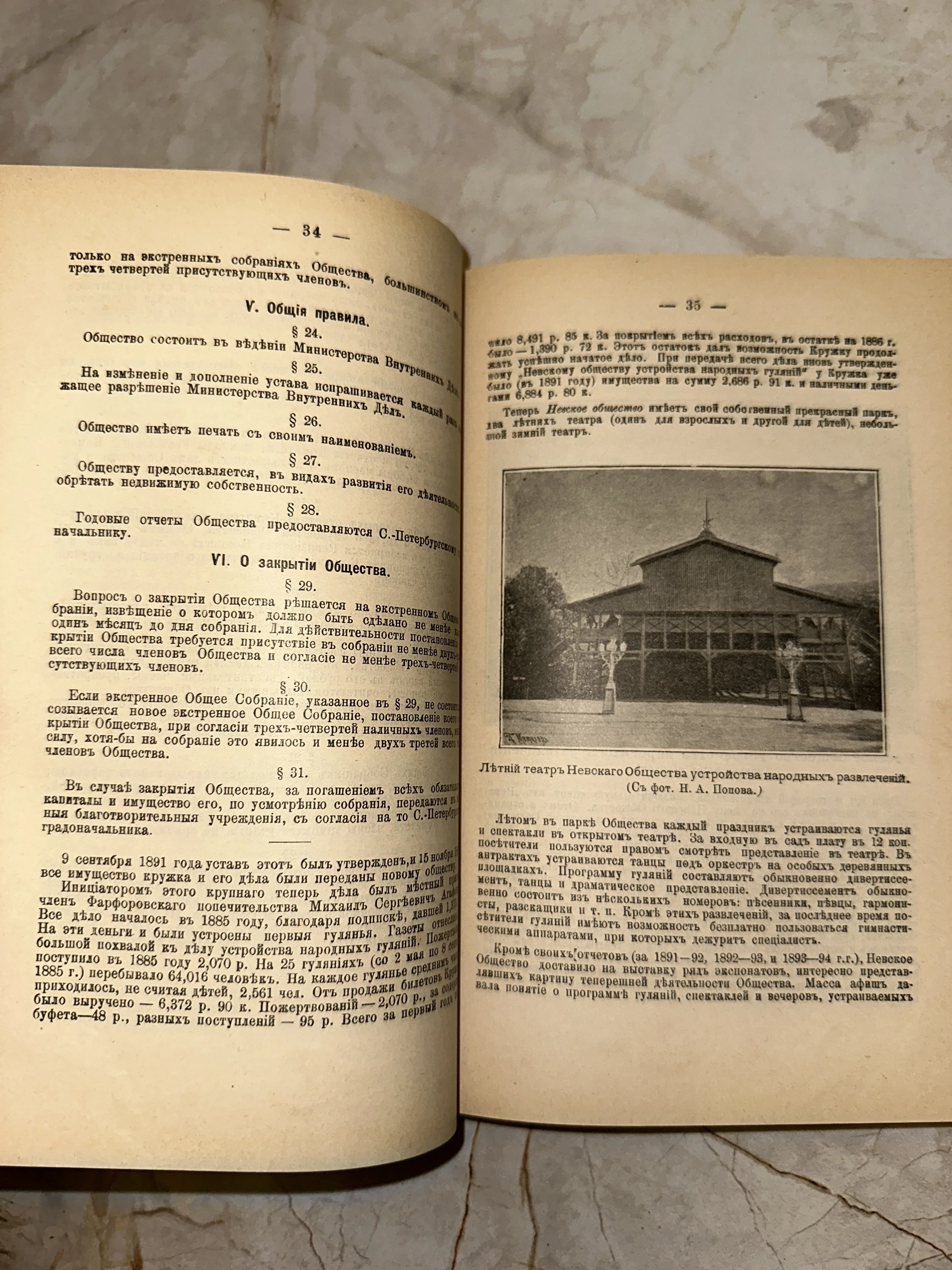 Перед вами уникальный исторический документ конца XIX века, описывающий деятельность Невского общества по организации народного досуга. На странице представлена редкая архивная иллюстрация Летнего театра, сопровождаемая подробным финансовым отчетом и правилами общества. Прекрасная сохранность типографской печати и характерная патина времени на бумаге делают этот экземпляр ценным артефактом эпохи.