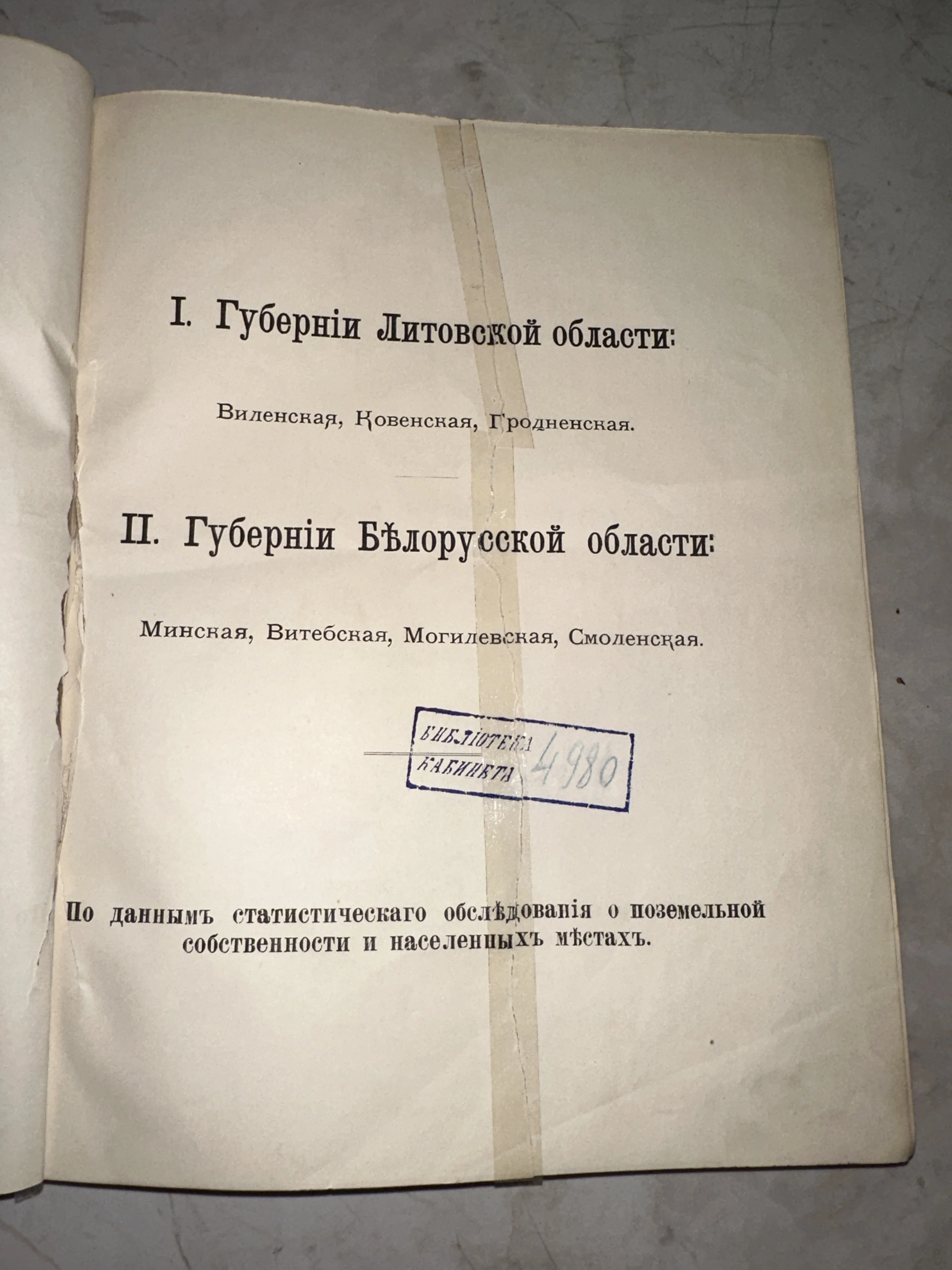 Страница старинной книги с перечислением Виленской, Ковенской, Гродненской, Минской и других губерний, с библиотечным штампом.
