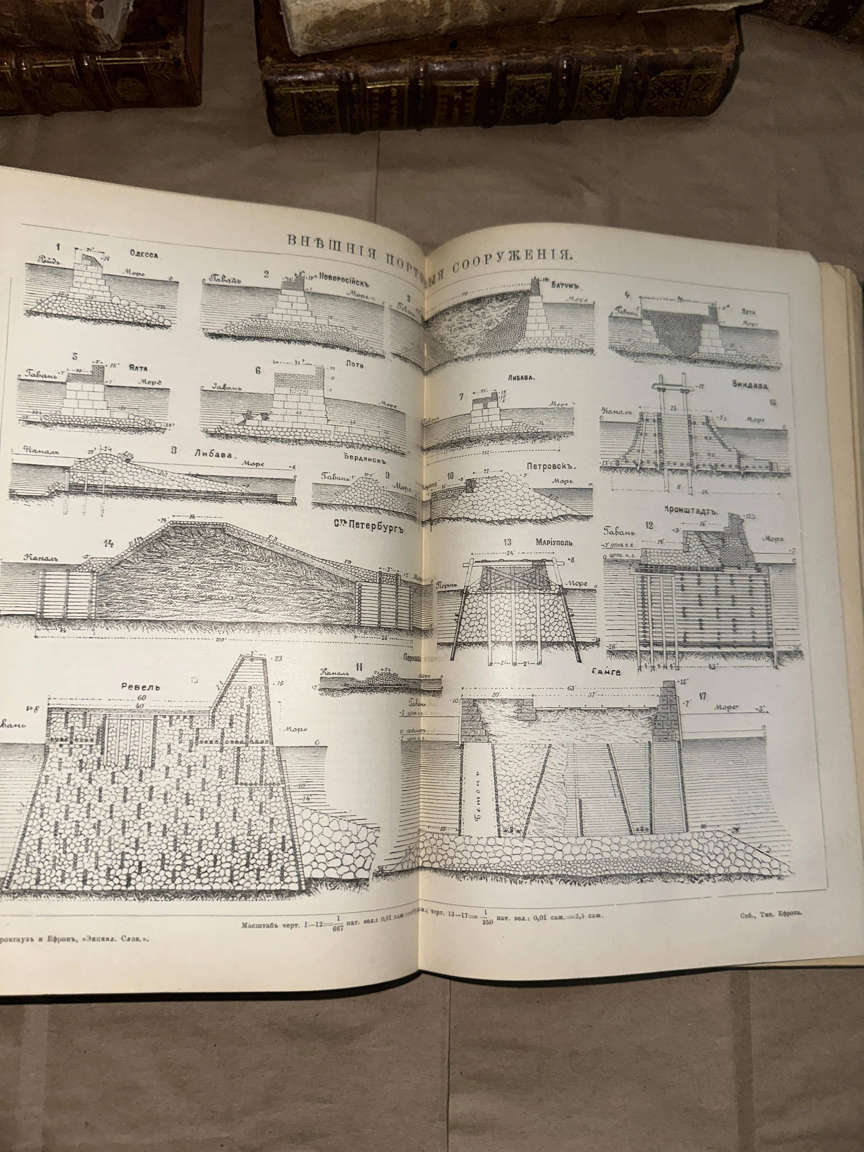 Уникальный разворот из фундаментального словаря Брокгауза и Ефрона, представляющий детальные инженерные схемы портовых укреплений Российской империи конца XIX века. На странице запечатлены разрезы волнорезов Одессы, Кронштадта, Ялты и других городов, выполненные с высочайшей графической точностью. Благородная желтизна бумаги и четкость типографской печати подчеркивают аутентичность и коллекционную ценность этого свидетельства эпохи великого инженерного прогресса.