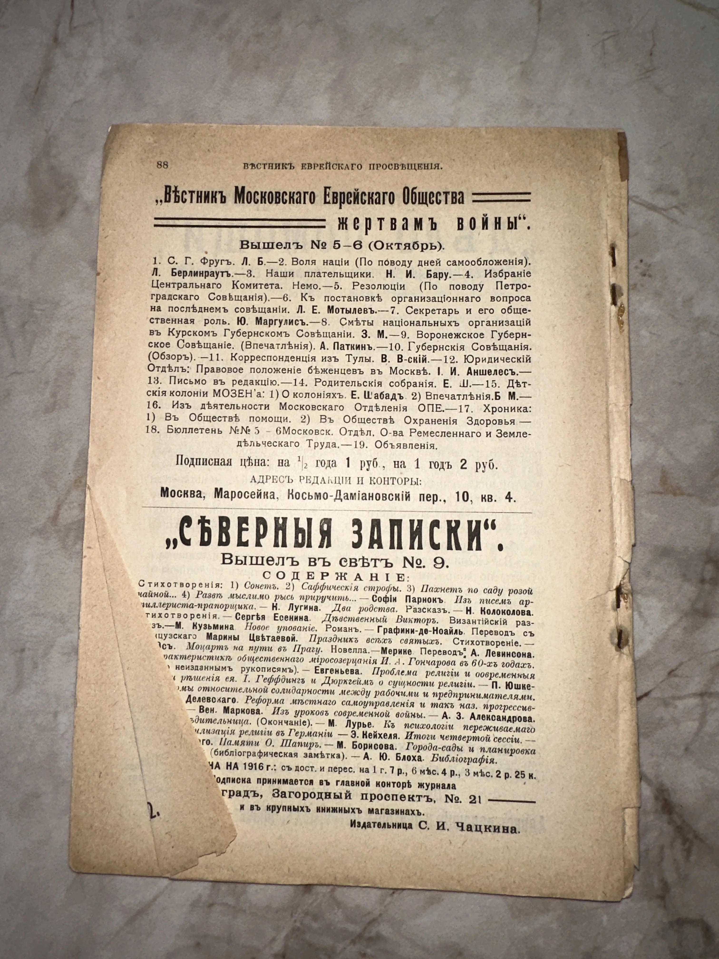 Подлинный артефакт эпохи Серебряного века — рекламная страница с оглавлением знаковых журналов. Особую коллекционную ценность представляет упоминание ранних публикаций С. Есенина и М. Цветаевой в журнале «Северные записки». Пожелтевшая бумага с патиной времени и дореволюционной орфографией идеально передает атмосферу литературной жизни России начала столетия.