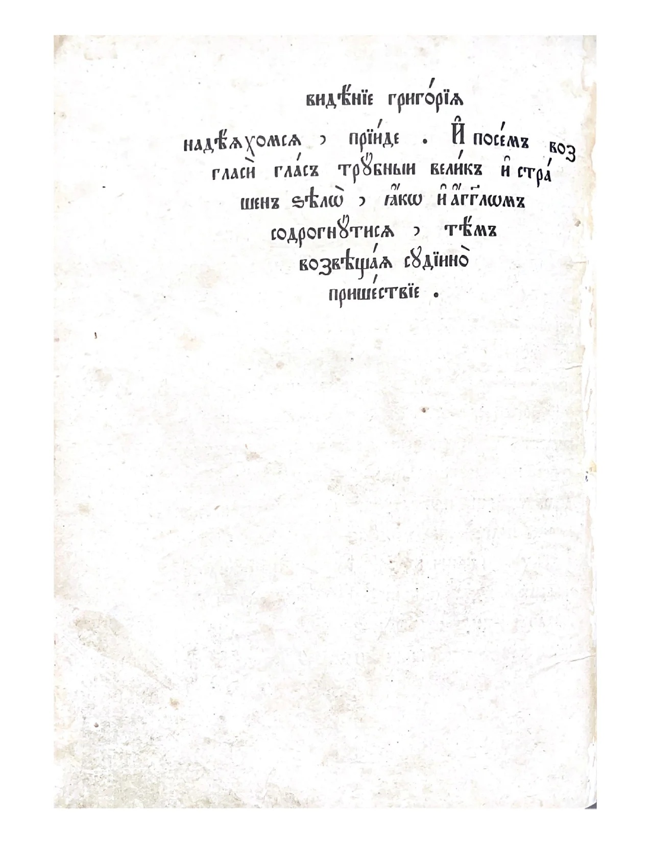 Перед вами фрагмент редкого духовного сочинения, повествующий о мистическом «Видении Григория». Текст выполнен каноническим шрифтом на плотной бумаге с характерными следами времени, что придает листу особую аутентичность. Этот артефакт представляет высокую историческую ценность для исследователей православной книжности и памятников древнерусской письменности.