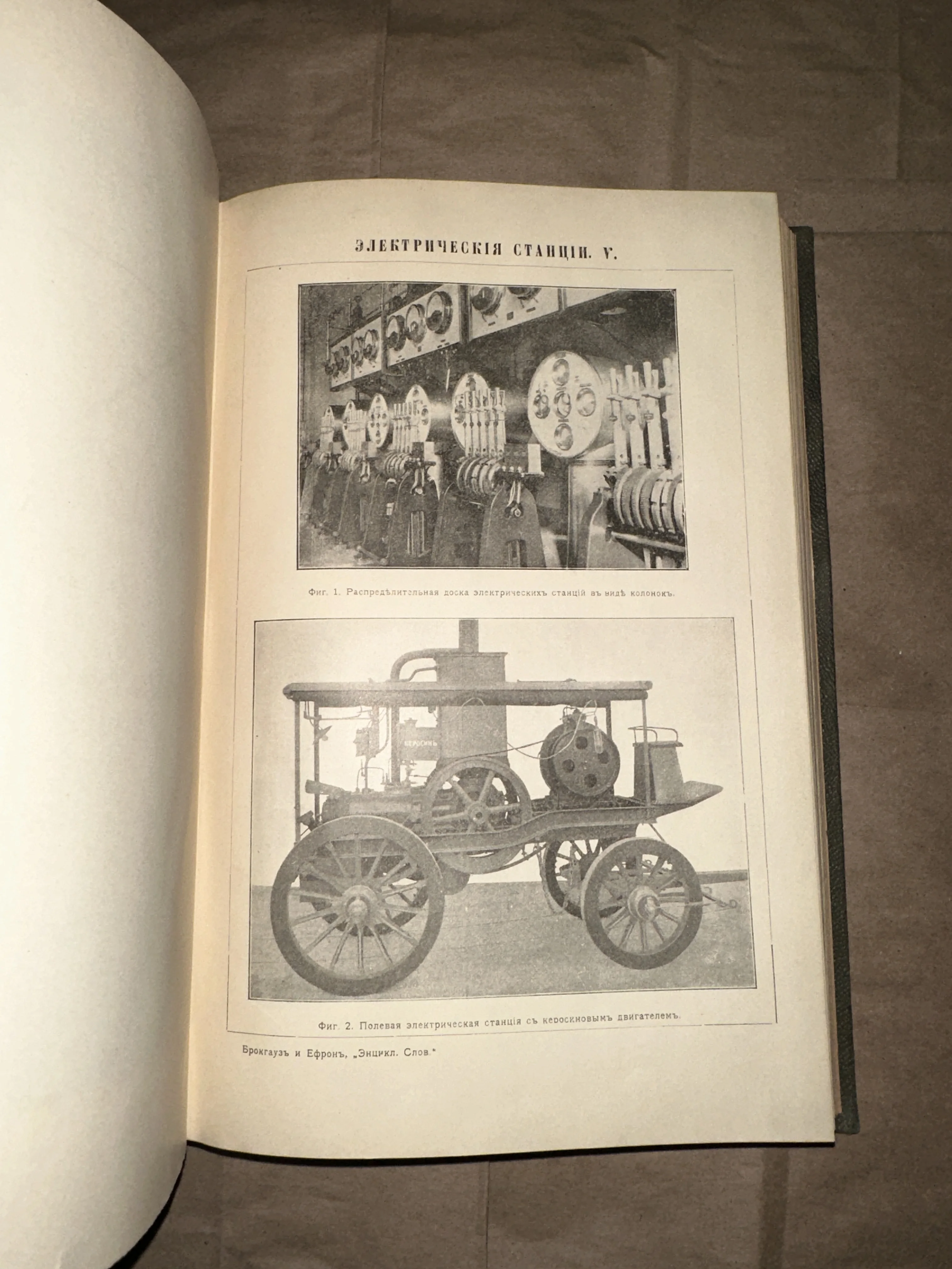 Уникальный оттиск из фундаментального энциклопедического словаря Брокгауза и Ефрона, наглядно демонстрирующий торжество инженерной мысли начала XX века. На странице представлены детализированные гравюры распределительного щита и редкой мобильной станции, сохранившие четкость линий на благородно состаренной бумаге. Этот артефакт — живое свидетельство эпохи промышленной революции и прекрасный подарок для ценителей истории техники.