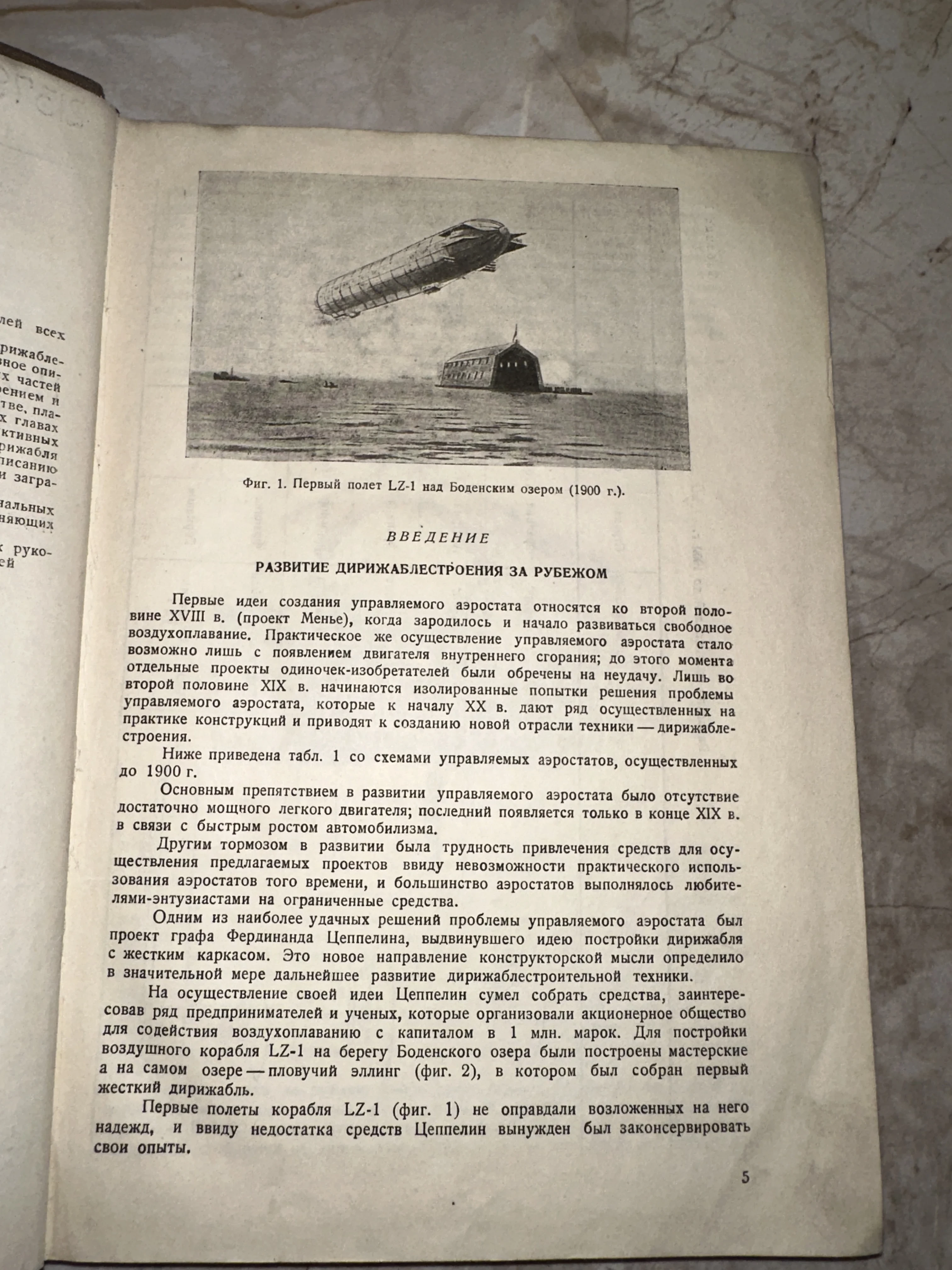 Раритетная страница из технического издания, посвященного заре воздухоплавания и амбициозным проектам графа Цеппелина. Текст повествует о развитии дирижаблестроения, а детальная иллюстрация первого полета LZ-1 передает дух великих открытий начала XX века. Состояние бумаги с естественной патиной времени придает документу особую коллекционную привлекательность.