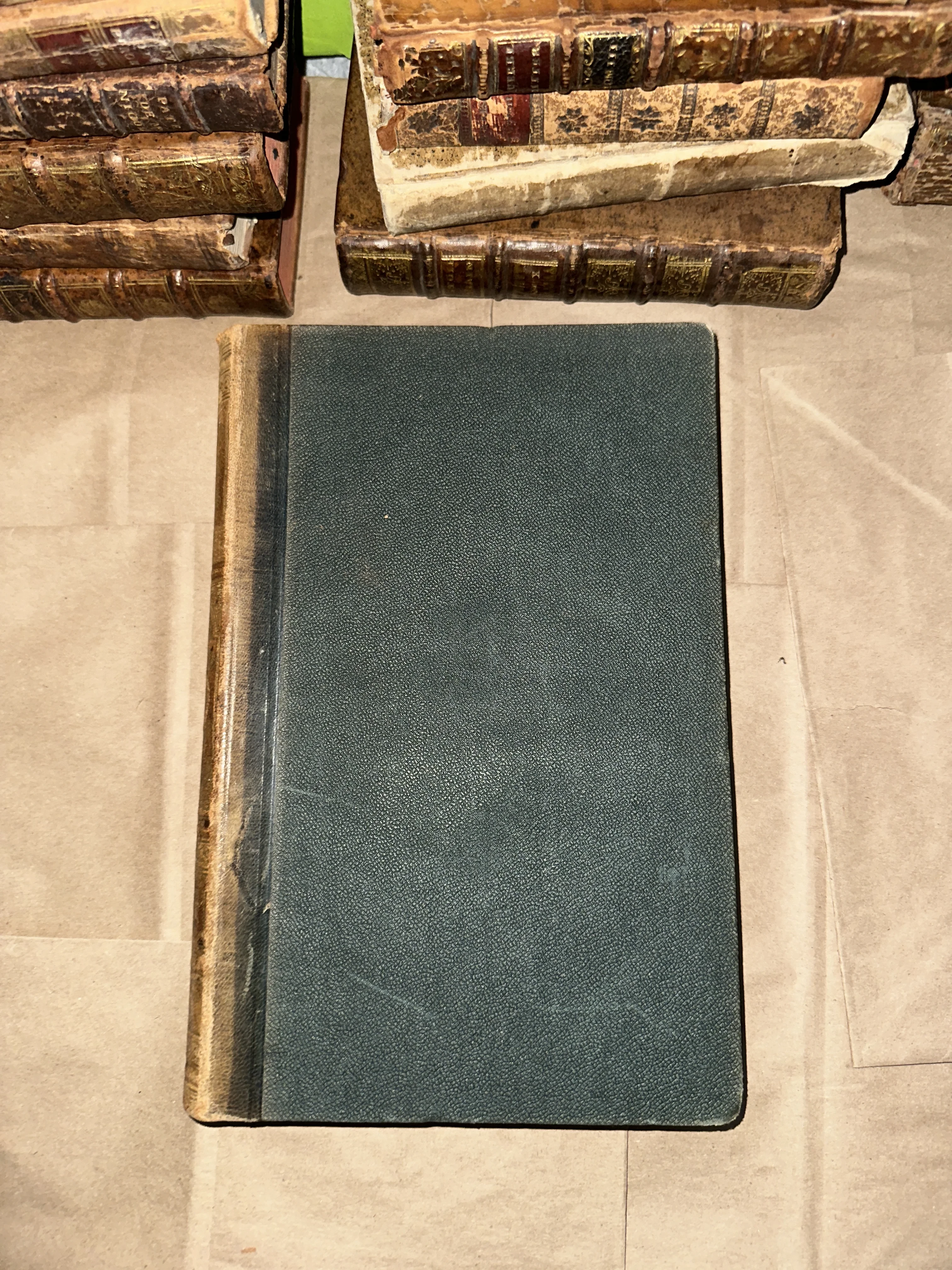 Изящный антикварный том с благородной фактурной обложкой, сохранивший дух ушедшей эпохи. На заднем плане видны классические кожаные корешки с искусным золотым тиснением, подчеркивающие историческую ценность коллекции. Превосходный экземпляр для частной библиотеки и ценителей редких печатных изданий.