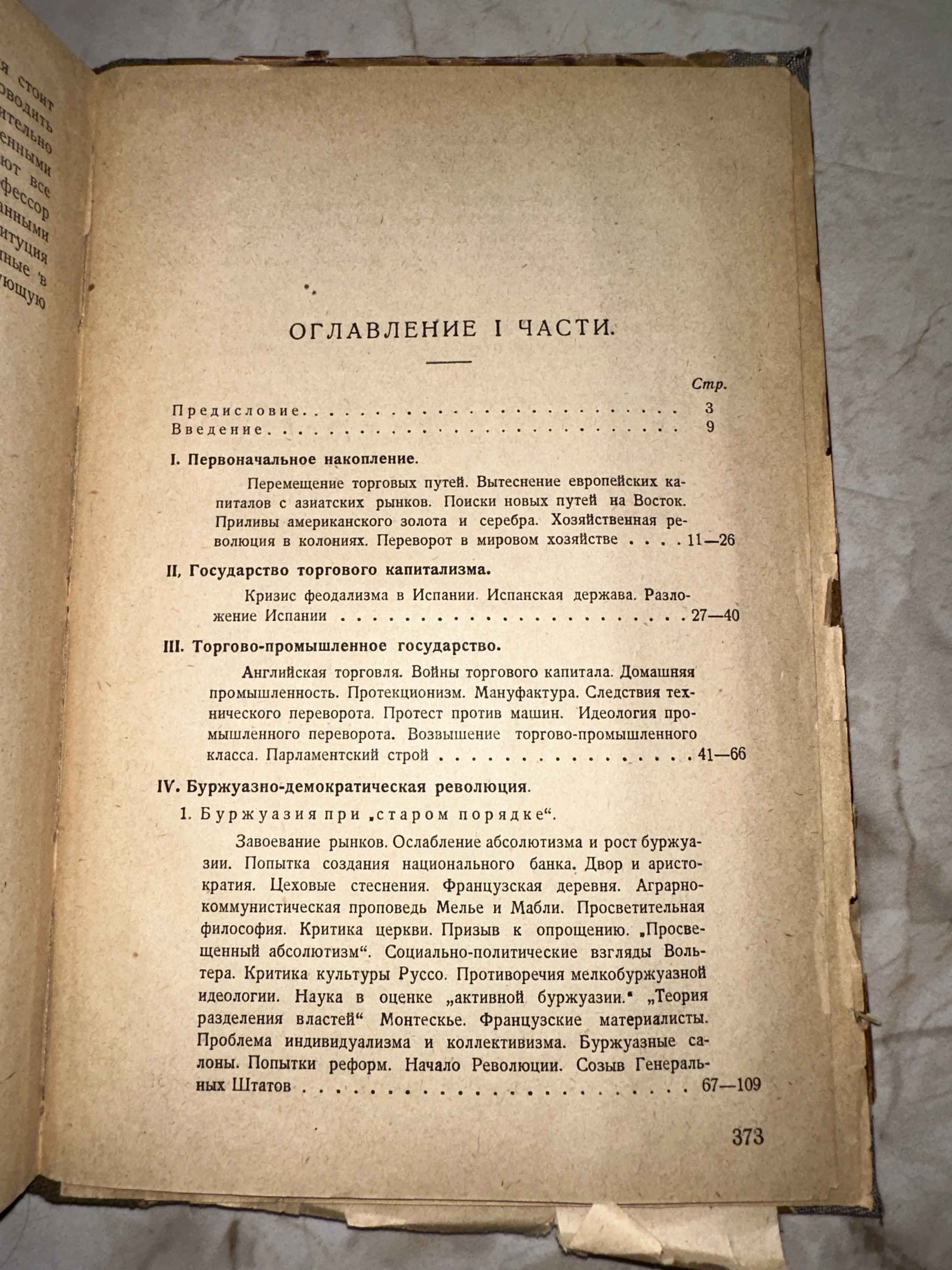 Страница оглавления старинной книги с разделами о первоначальном накоплении капитала и буржуазных революциях.