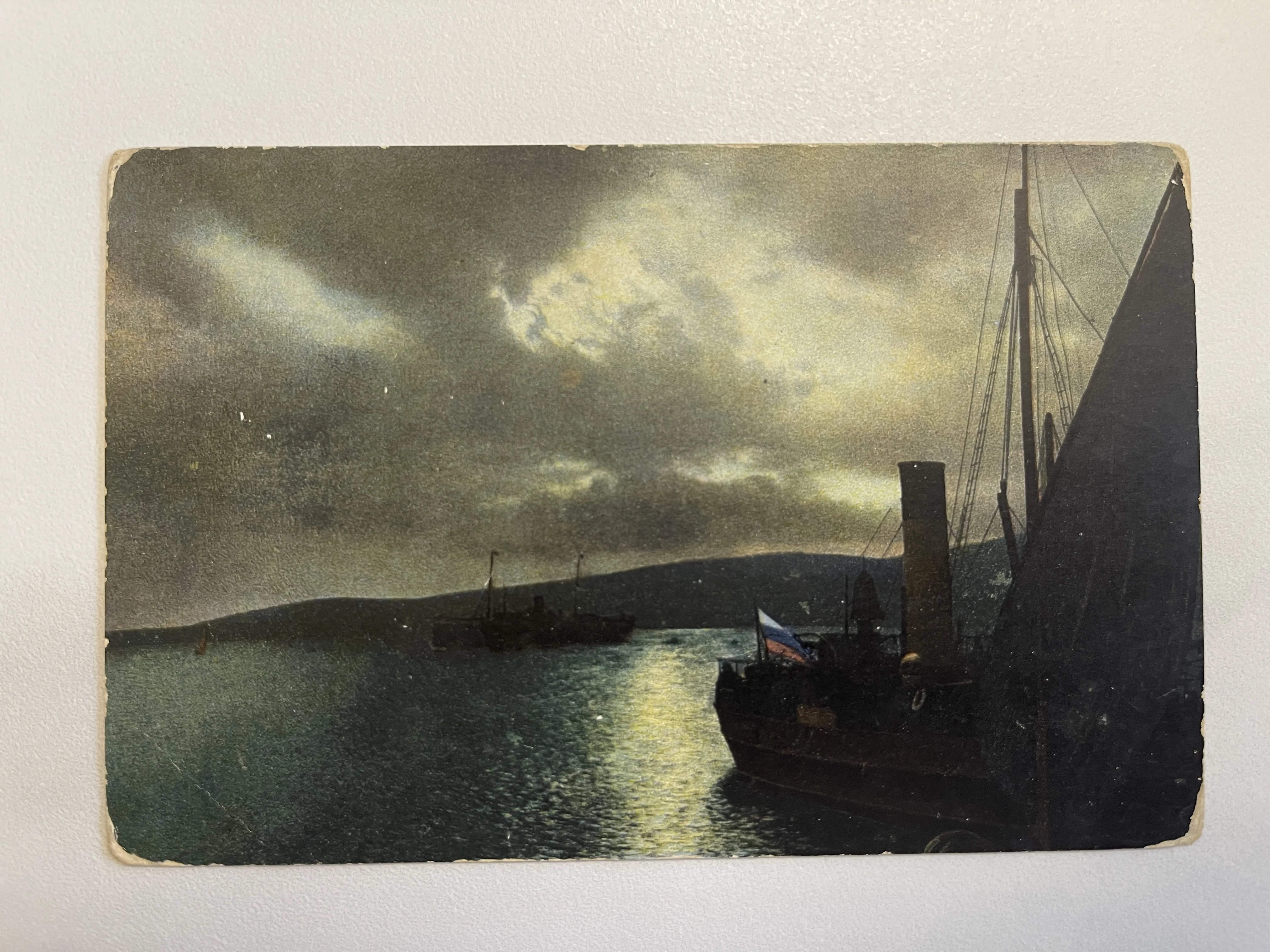 Редкий образец печатной графики начала XX века, передающий мистическую атмосферу ночной гавани с живописными бликами на воде. На переднем плане отчетливо виден силуэт судна с российским триколором, а характерные потертости углов и мягкая патина времени подчеркивают подлинность этого коллекционного экземпляра.