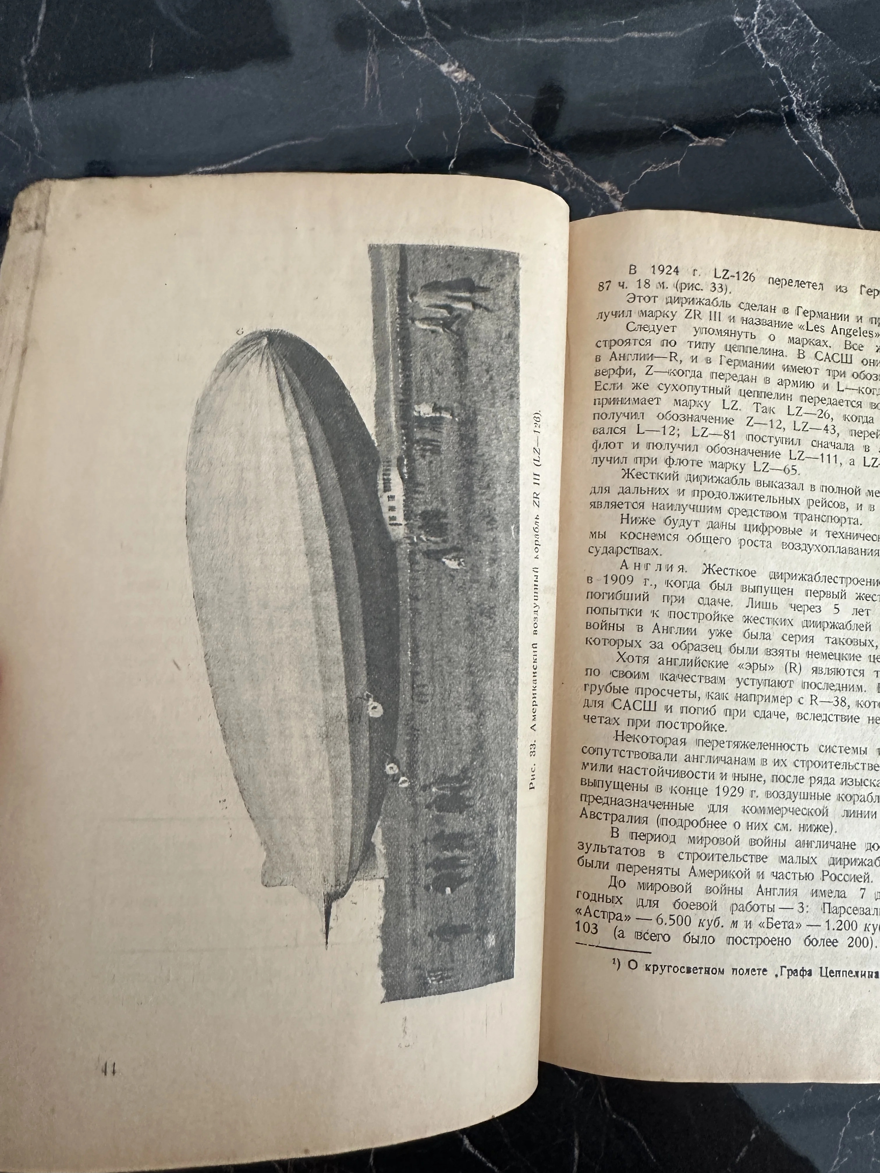 Редкая книжная иллюстрация, запечатлевшая легендарный воздушный корабль ZR III (LZ-126) в эпоху расцвета дирижаблестроения. Пожелтевшая от времени бумага и характерная типографская печать передают дух великих технических открытий начала XX века. Текст содержит исторические справки о немецких и американских цеппелинах, что делает этот фрагмент ценным находкой для историков техники.