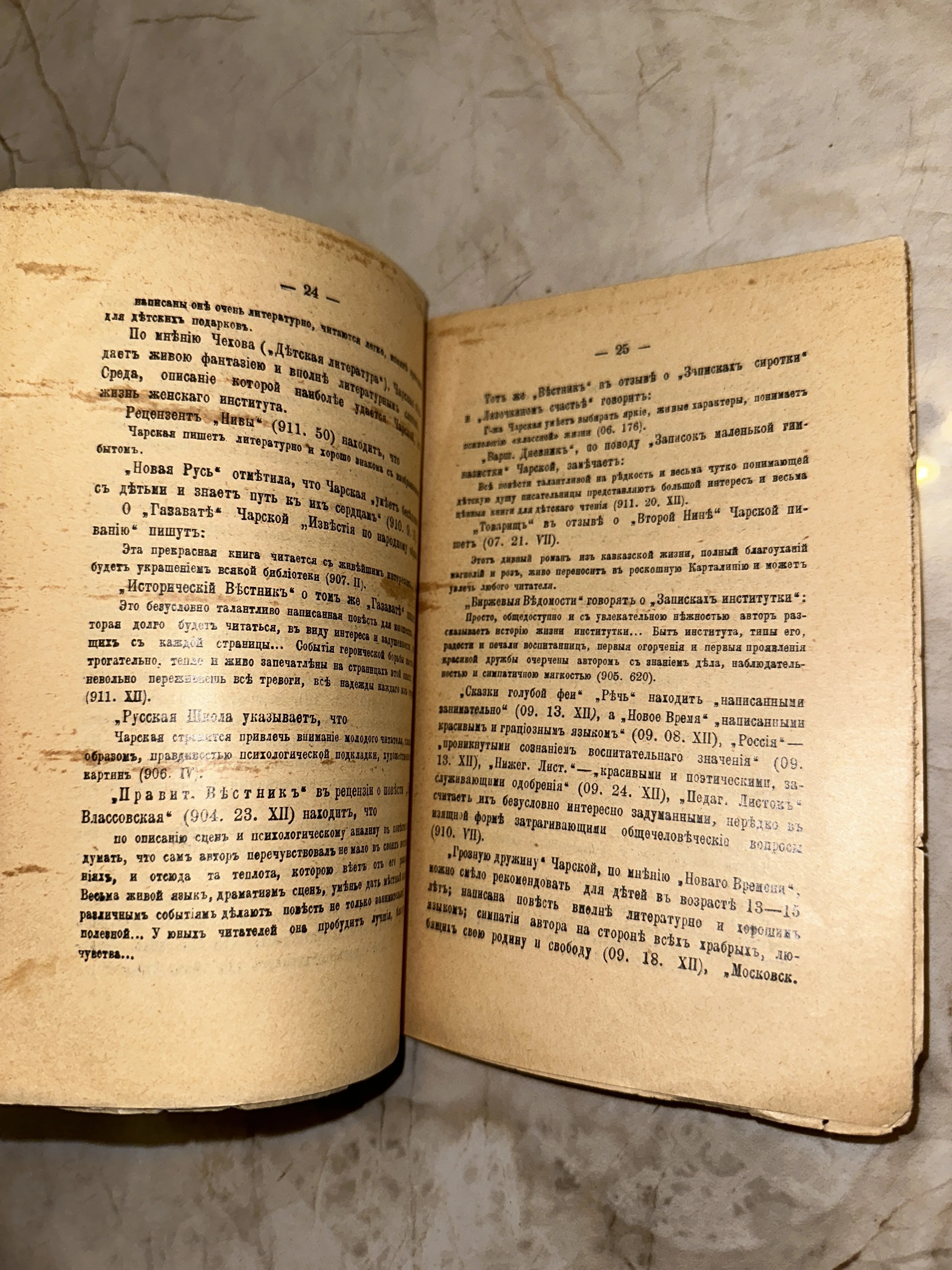 Разворот старинной книги с текстом на дореволюционном русском языке, страницы 24-25 с упоминанием произведений Лидии Чарской.