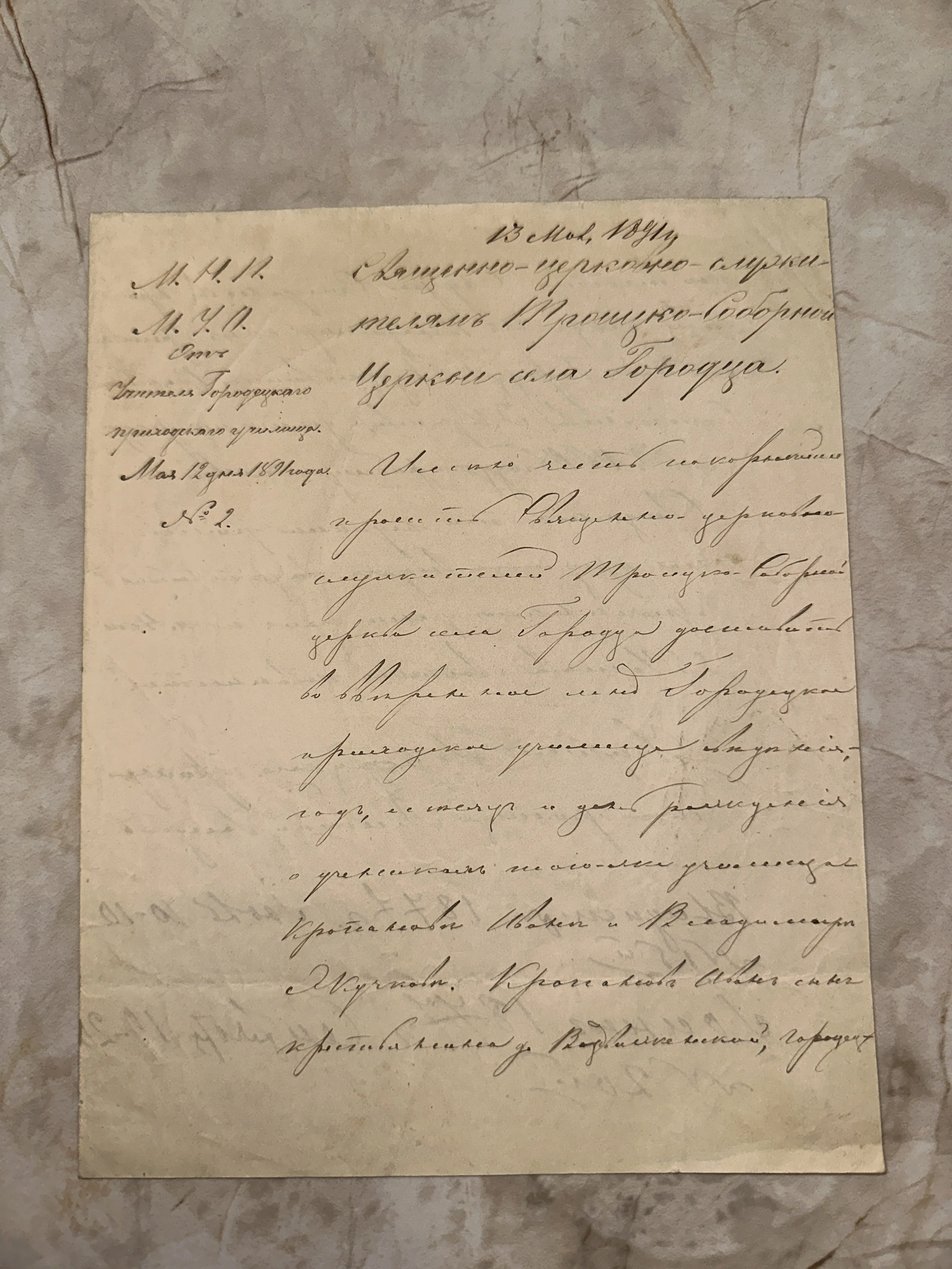 Пожелтевший лист бумаги с каллиграфическим рукописным текстом на русском языке, датированный 13 мая 1891 года.