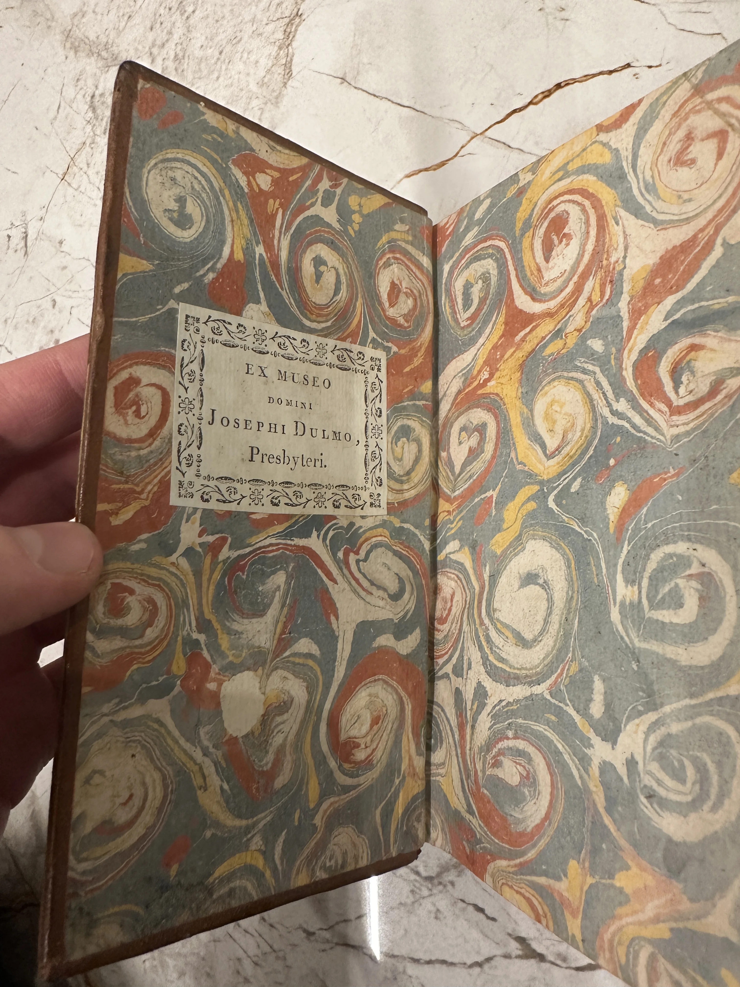 Разворот антикварной книги с ручным мраморированием бумаги и книжным знаком Josephi Dulmo.