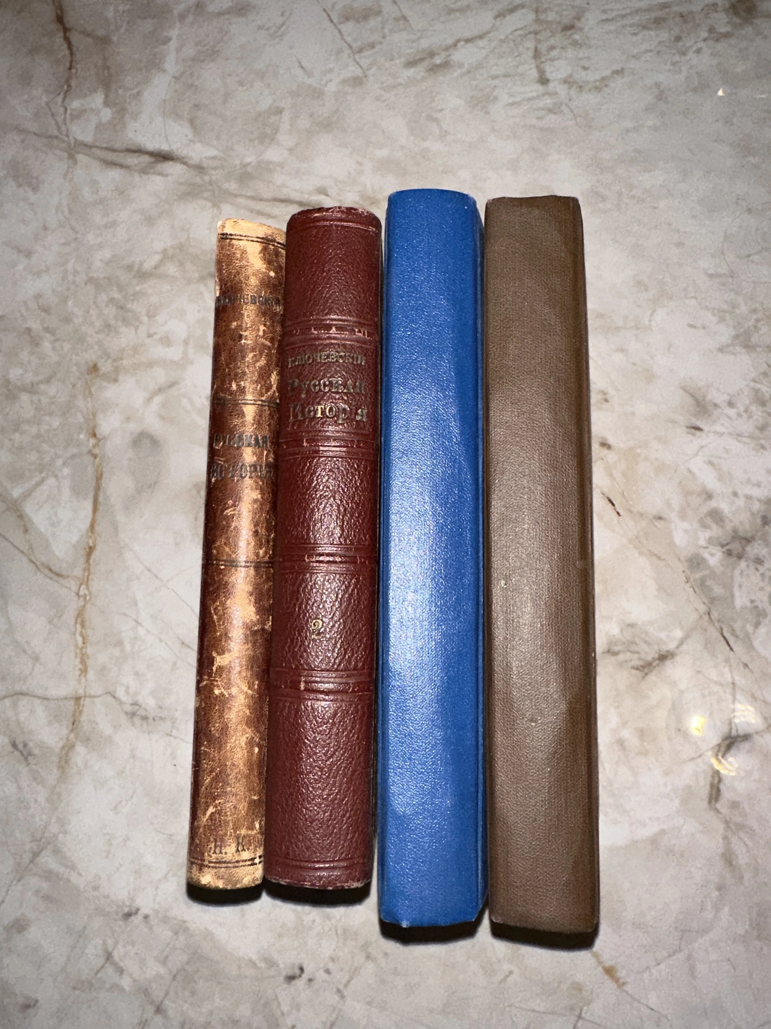 Корешки четырех старинных книг в кожаных и тканевых переплетах, включая издания Ключевского, на мраморной поверхности.