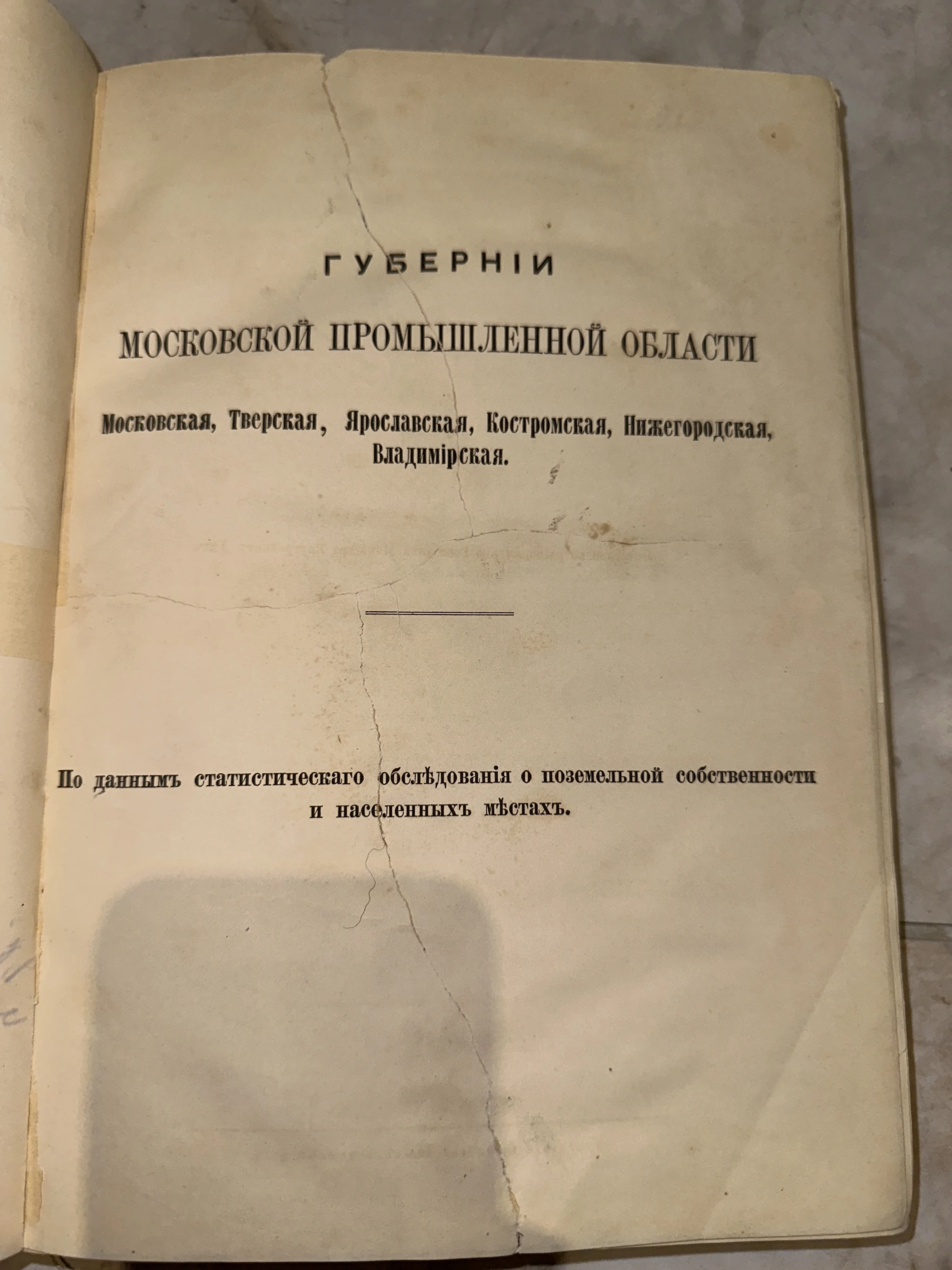 Титульный лист старинного издания о поземельной собственности и населенных местах Московской, Тверской, Ярославской и других губерний.
