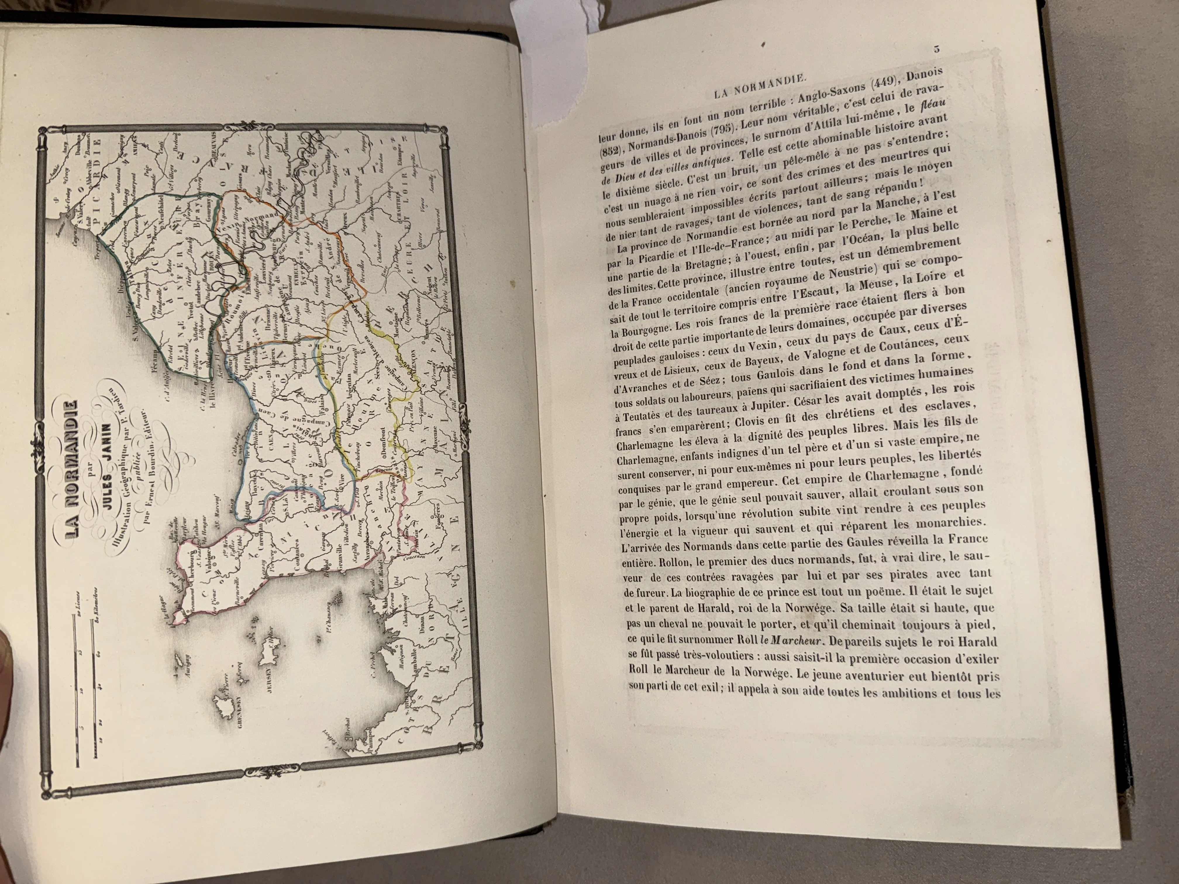 Изящная гравированная карта XIX века из фундаментального труда Жюля Жанена, детально отображающая топографию исторической Нормандии. Плотная бумага с легкой патиной времени и четкий оттиск гравюры подчеркивают коллекционную ценность этого экземпляра. Текст на французском языке дополняет художественную композицию, погружая в атмосферу классических европейских путешествий.