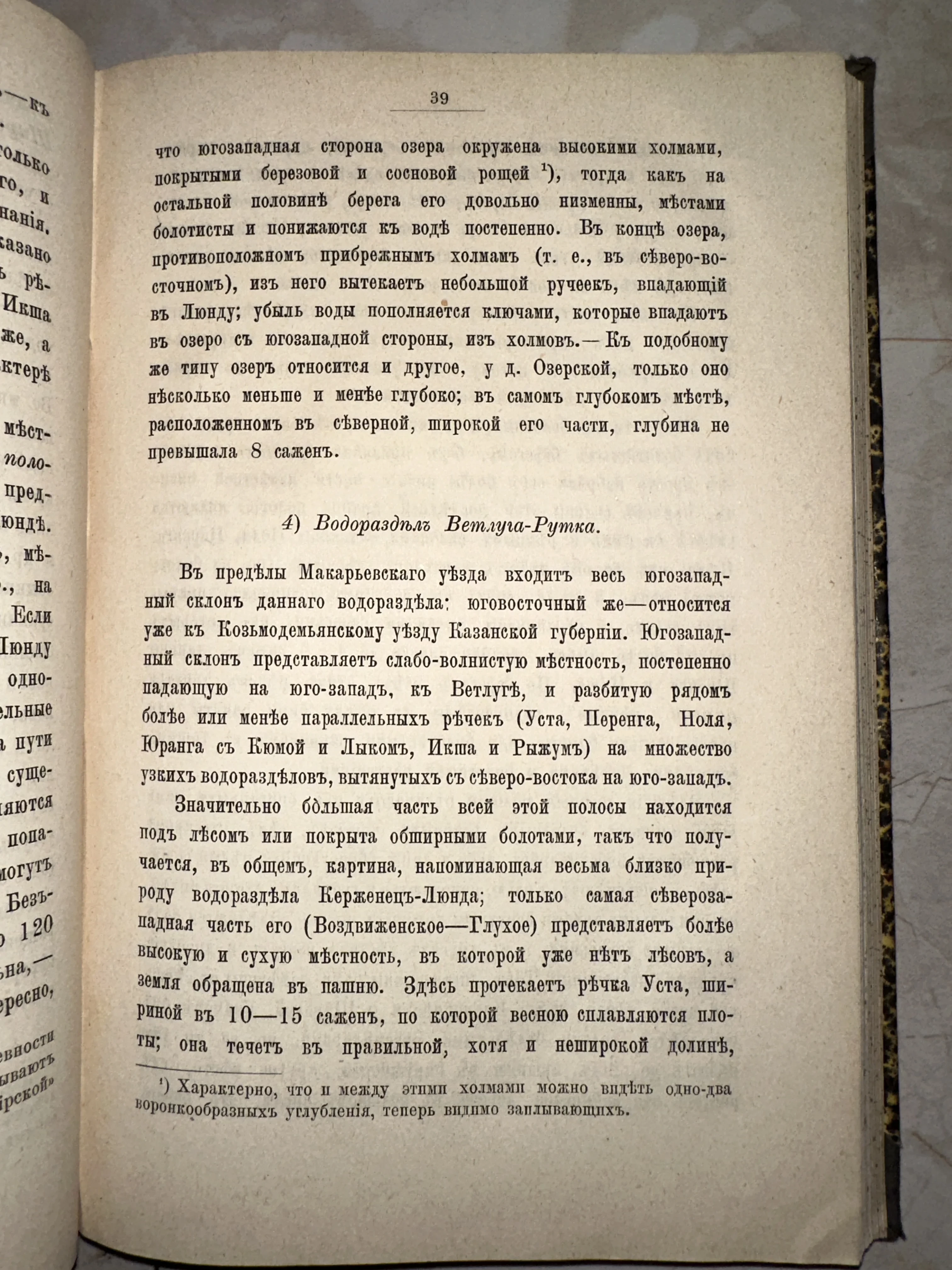 Фотография страницы антикварной книги под номером 39 с текстом на дореволюционном русском языке о географии Макарьевского уезда.