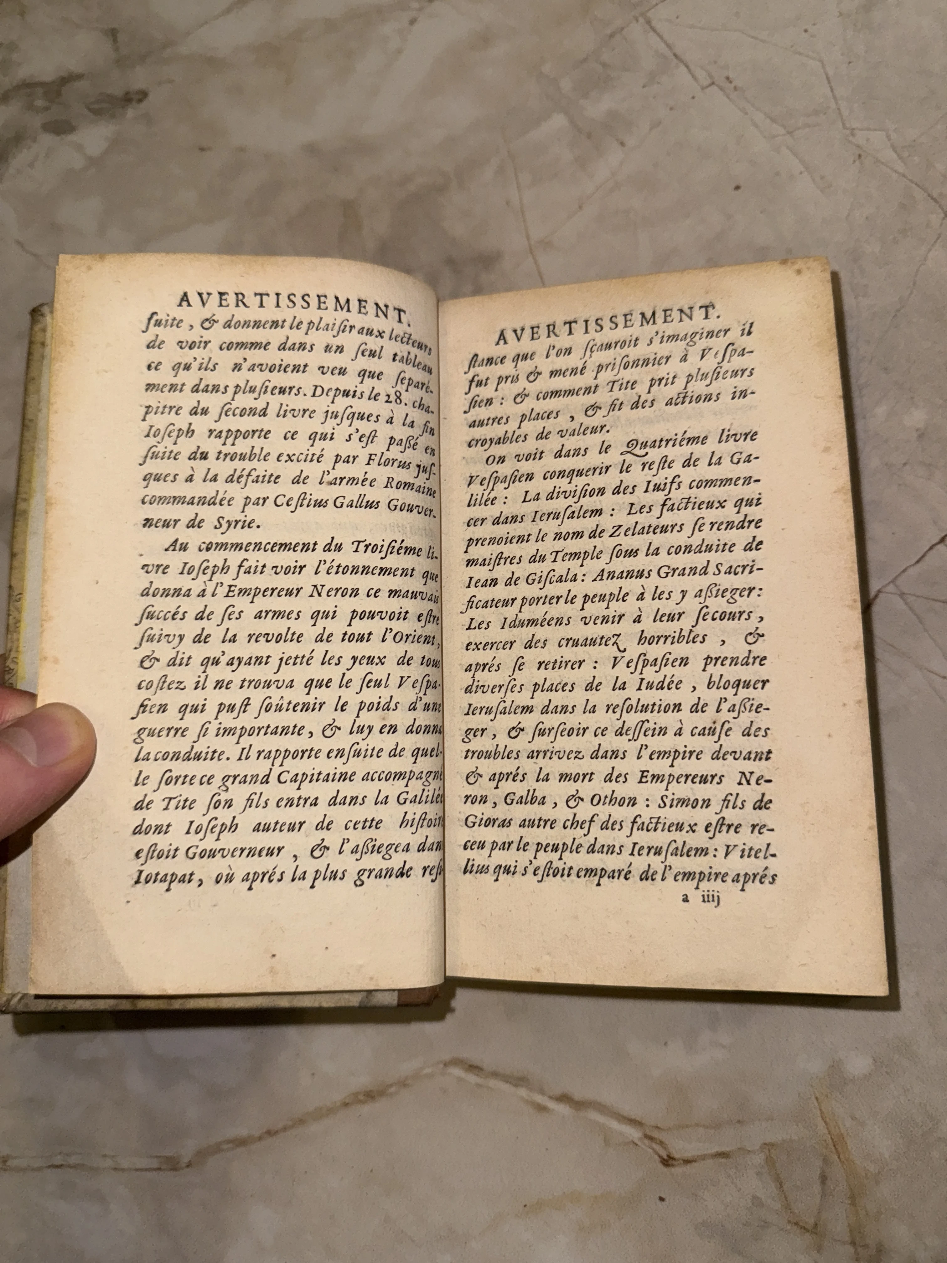 Разворот старинной книги на французском языке с заголовком Avertissement и текстом об Иосифе Флавии.
