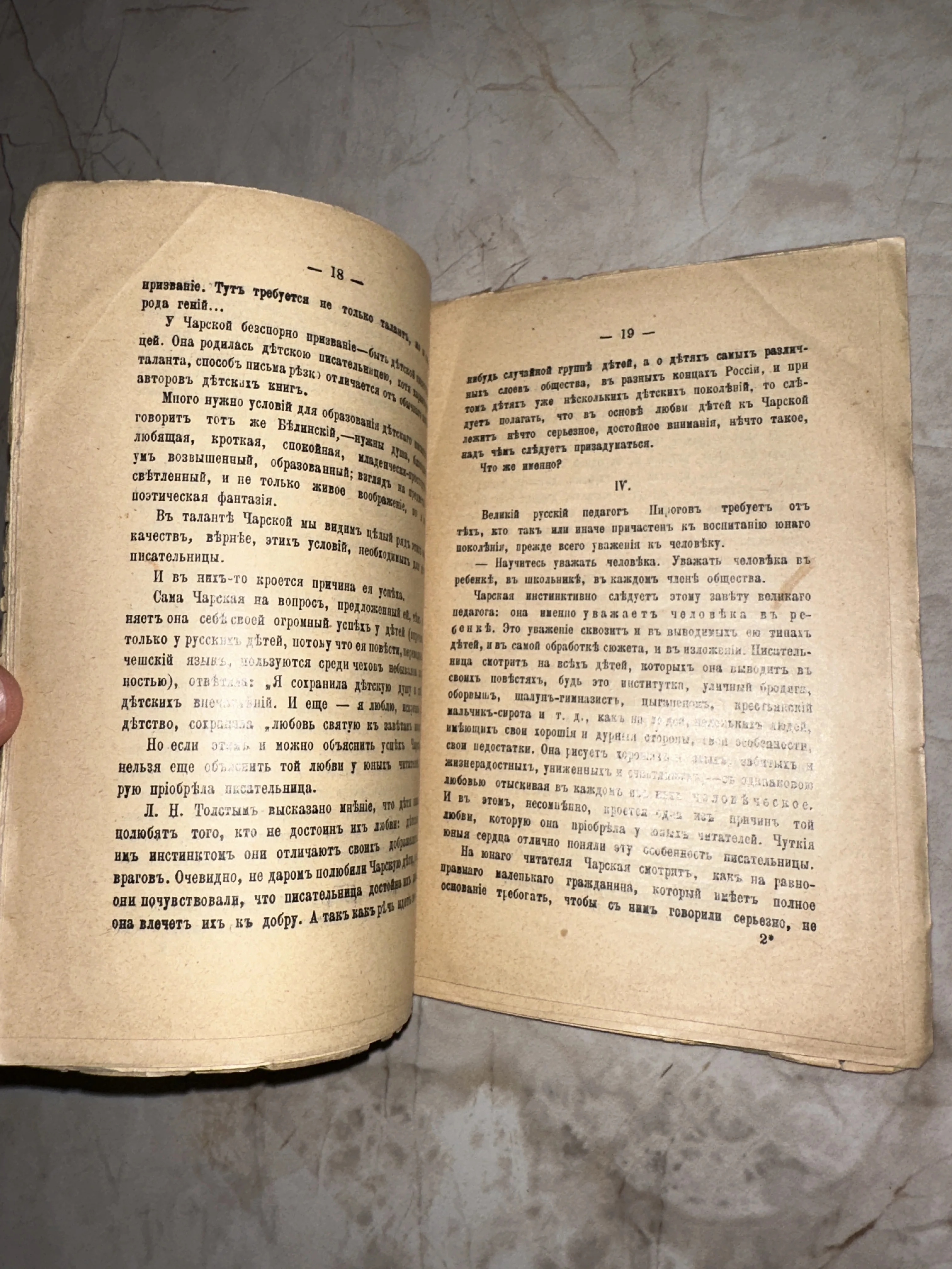 Раритетный разворот начала XX века, сохранивший живое дыхание истории на своих пожелтевших страницах. Текст в дореволюционной орфографии посвящен анализу детской литературы, упоминая мнения Белинского и Толстого. Прекрасный коллекционный экземпляр с характерной патиной времени и подлинным типографским шрифтом той эпохи.