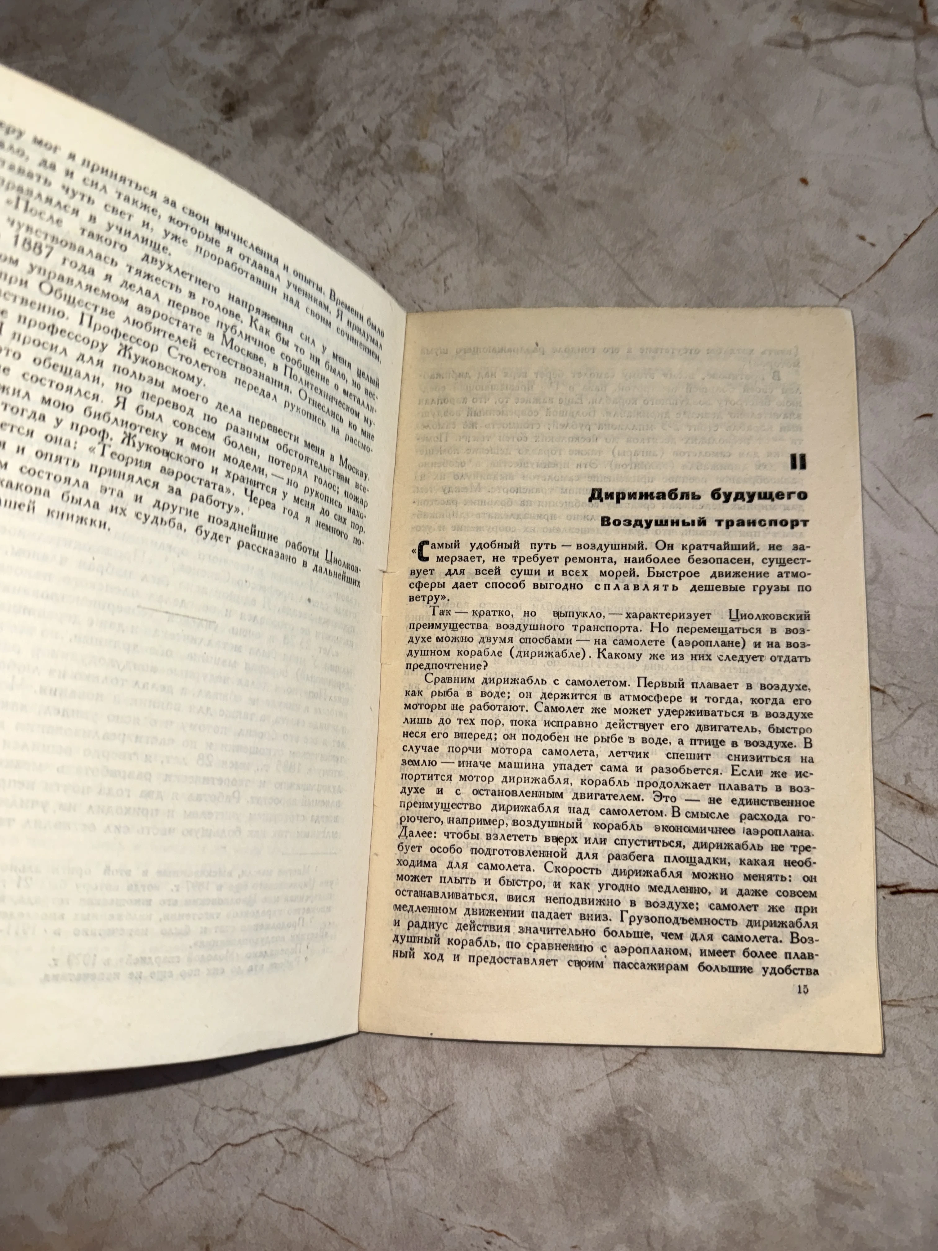 Уникальный книжный разворот, представляющий футуристические идеи начала XX века о развитии воздушного транспорта и трудах К. Э. Циолковского. Пожелтевшие страницы и характерная антикварная типографика передают атмосферу великих открытий и веры в технический прогресс. Экземпляр будет ценным приобретением для коллекционеров научно-популярной литературы и исследователей истории авиации.