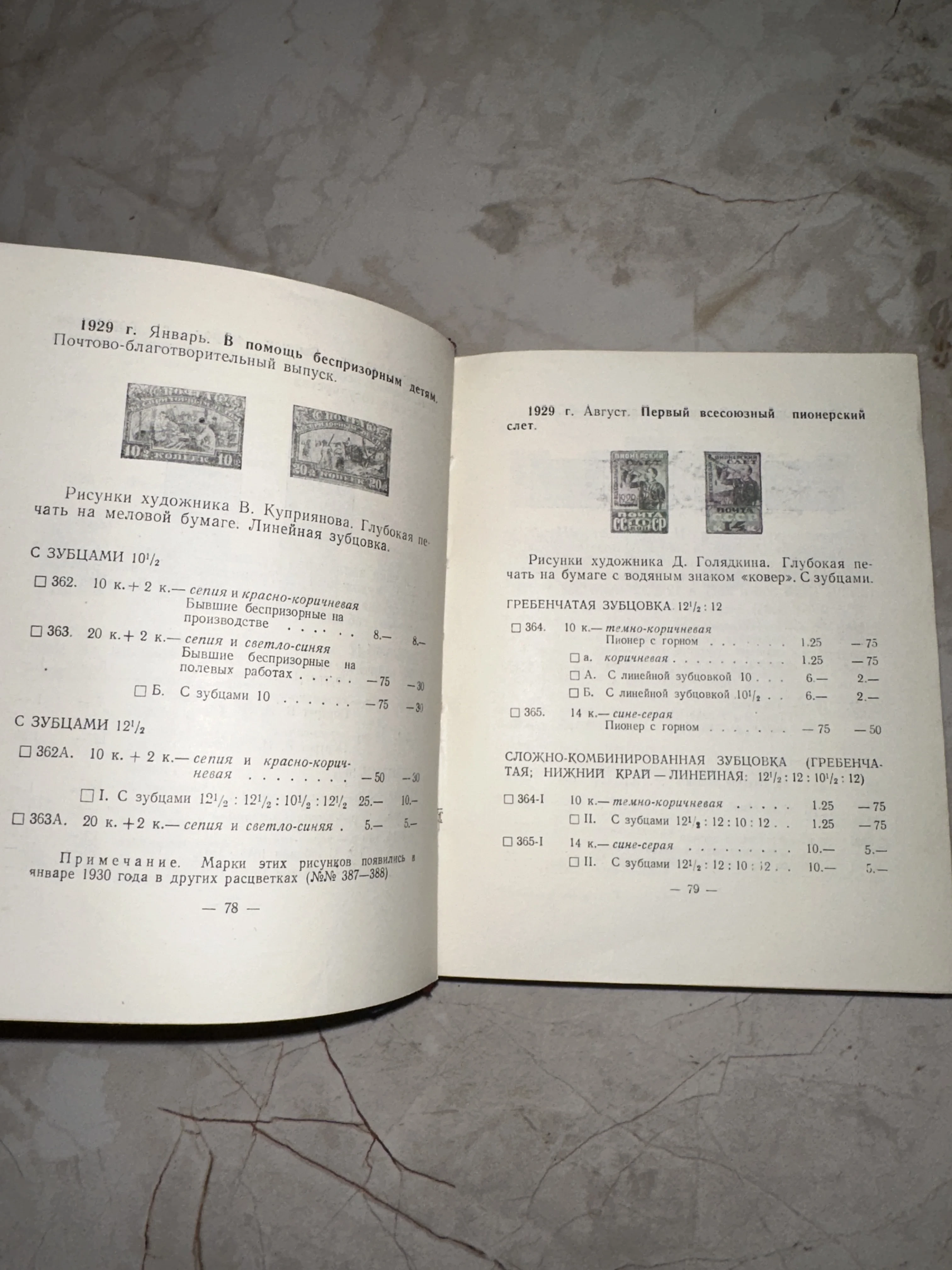Этот редкий разворот филателистического справочника представляет собой ценный исторический документ, детально описывающий знаковые почтовые выпуски раннесоветского периода. Страницы содержат подробную информацию о типах зубцовки и художниках-оформителях, отражая дух эпохи через темы помощи детям и становления пионерского движения. Прекрасная сохранность типографского текста и четкость таблиц делают этот экземпляр идеальным дополнением коллекции профессионального букиниста или филателиста.