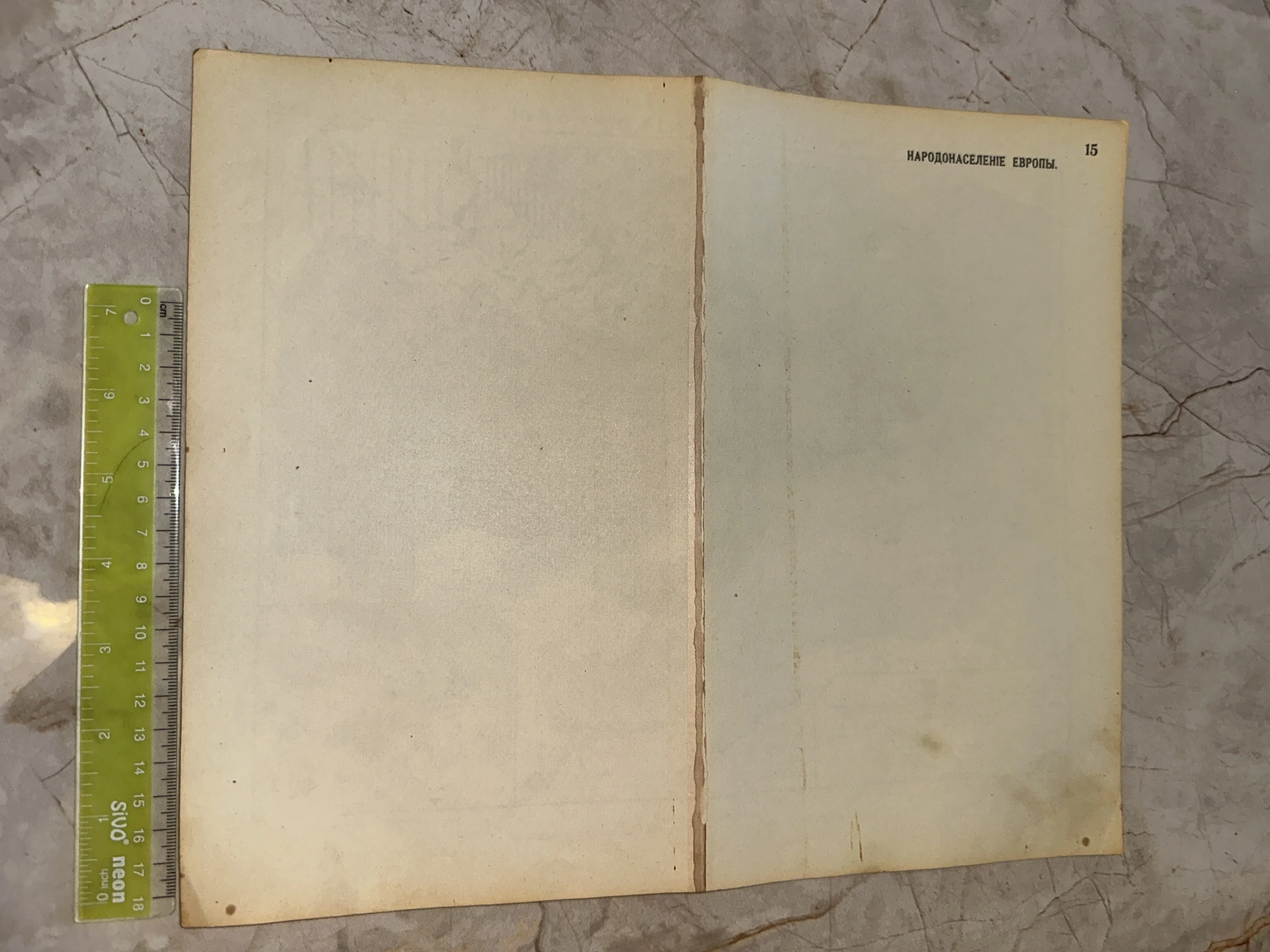 Разворот старинной пожелтевшей страницы с дореволюционным заголовком Народонаселение Европы, сфотографированный рядом с измерительной линейкой.