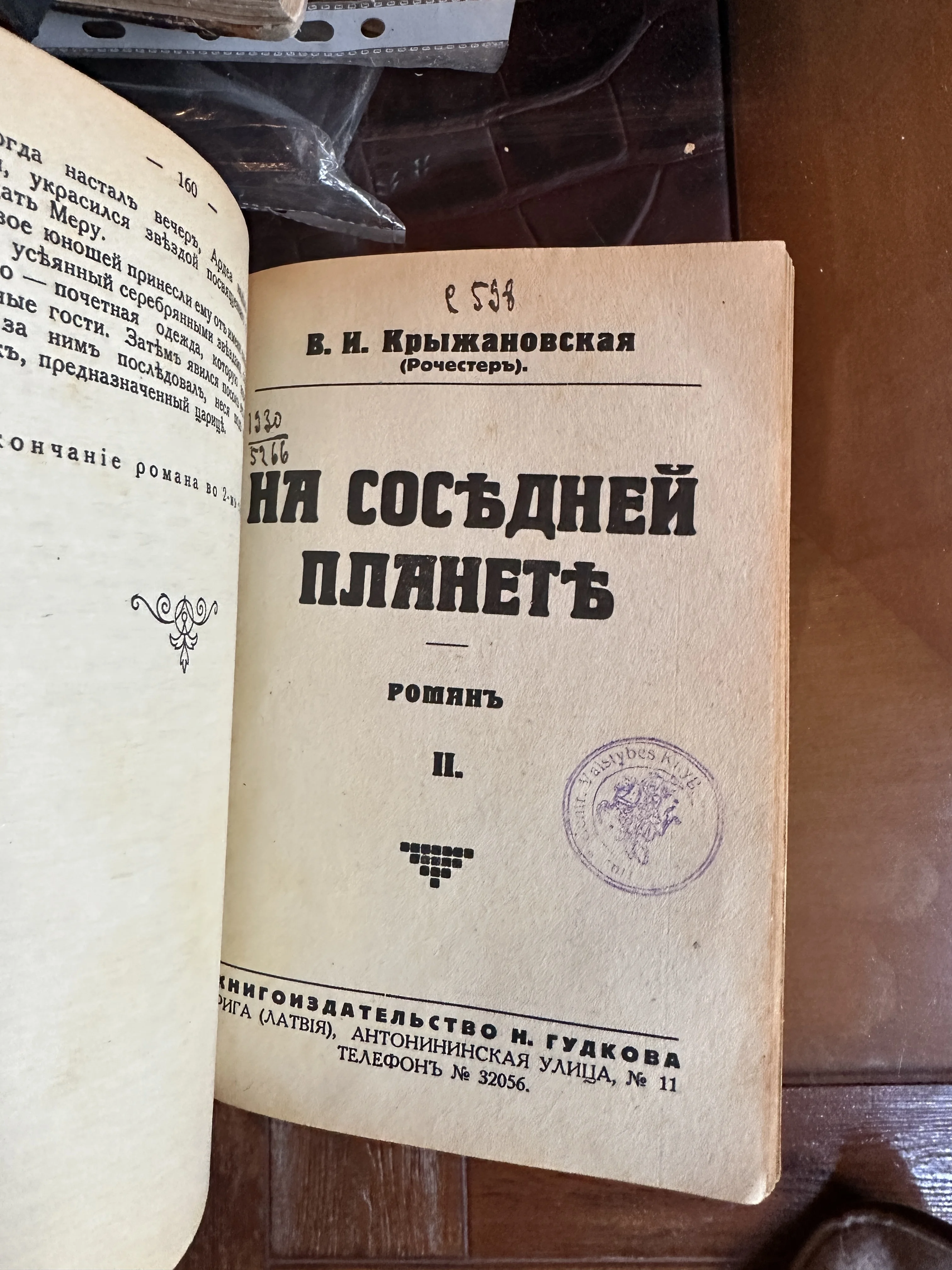 Титульный лист старинной книги Веры Крыжановской «На соседней планете», изданной в Риге издательством Н. Гудкова.