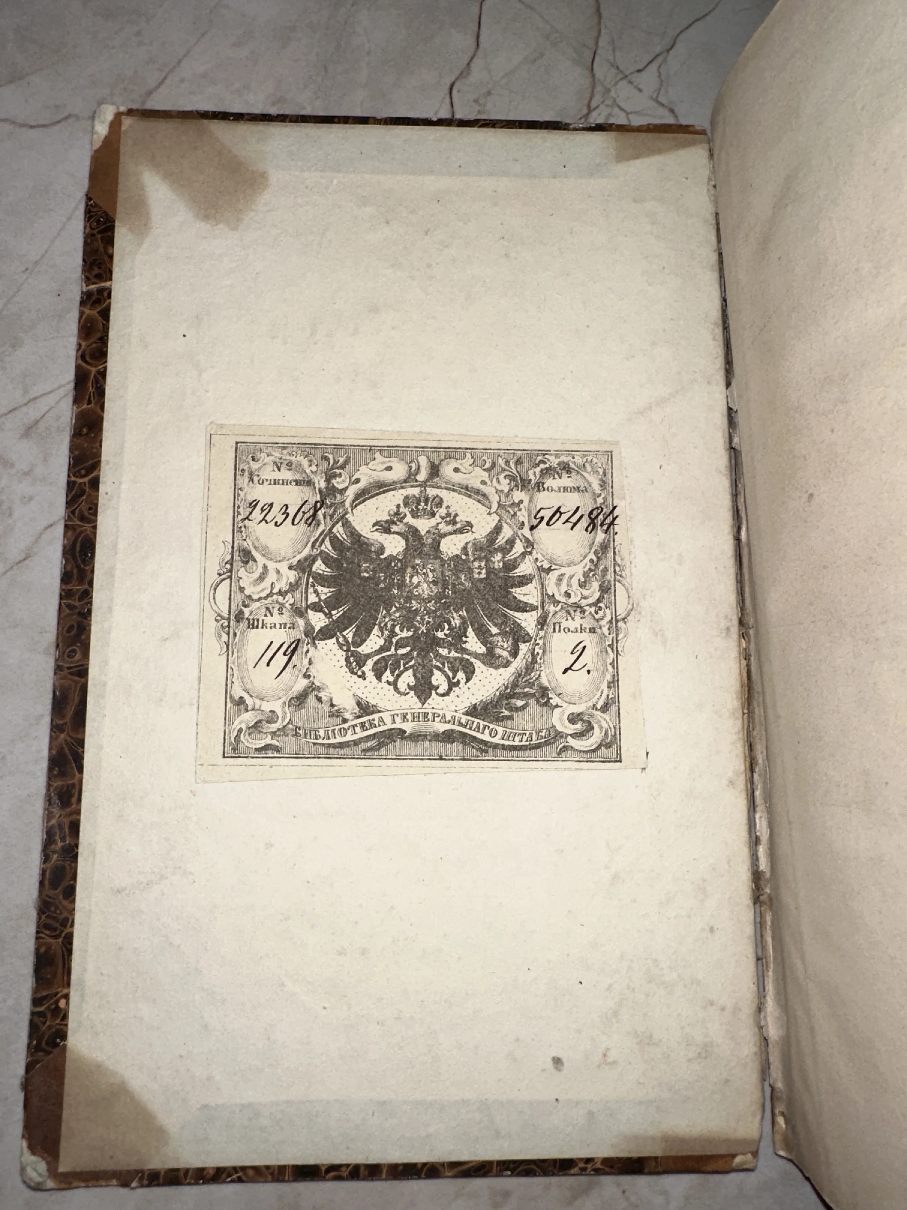 Уникальный артефакт из закрытого военного собрания Российской империи, отмеченный изящным экслибрисом с гербовым двуглавым орлом. Сохранившиеся рукописные инвентарные номера и благородная патина на бумаге верже придают книге особую коллекционную ценность и историческую глубину. Мраморированная бумага на переплете подчеркивает статус издания, некогда хранившегося в залах Генерального штаба.