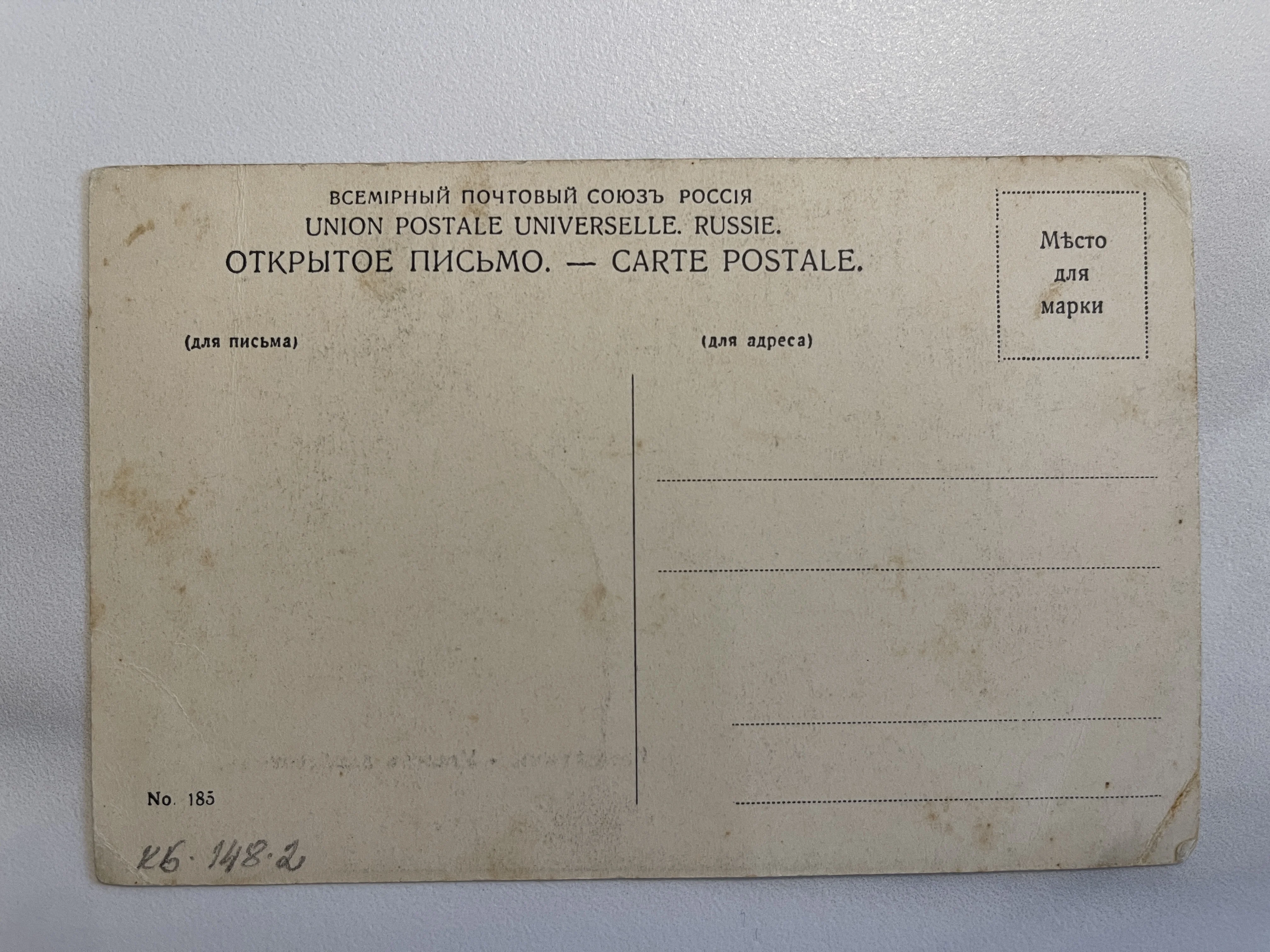Подлинный оборот почтовой карточки времен Российской Империи с характерной дореволюционной орфографией и двуязычными надписями Всемирного почтового союза. Благородная патина и легкое пожелтение бумаги подчеркивают солидный возраст предмета, делая его ценным экземпляром для коллекционеров почтовой атрибутики.