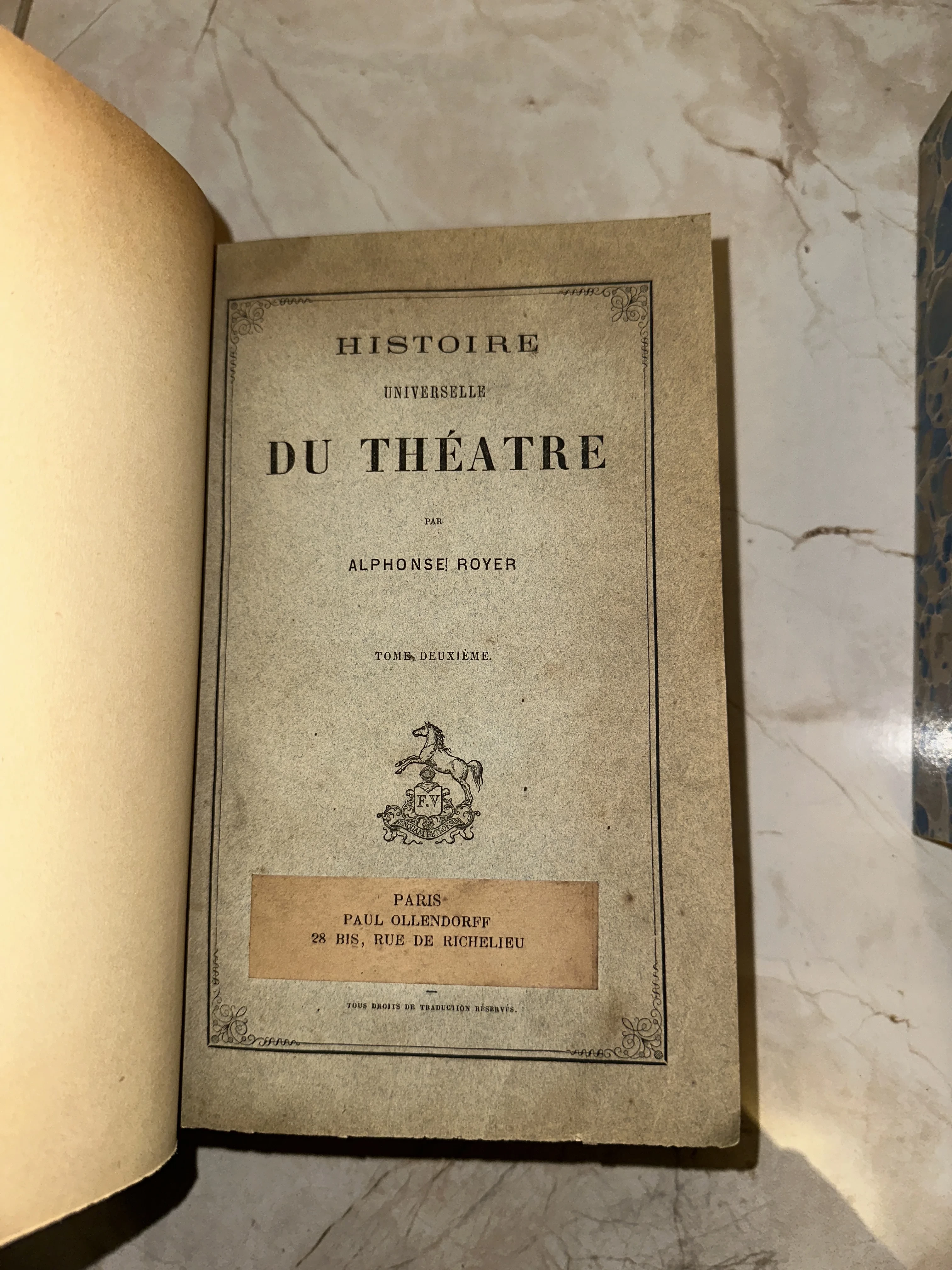 Перед вами редкий титульный лист второго тома фундаментального труда по истории театра, выпущенного знаменитым парижским издательством Поля Оллендорфа. Плотная вержеированная бумага с благородной патиной времени и изящный геральдический знак с изображением коня создают неповторимый шарм старинного фолианта. Этот экземпляр станет ценным пополнением библиотеки ценителя французской классики и театрального искусства.