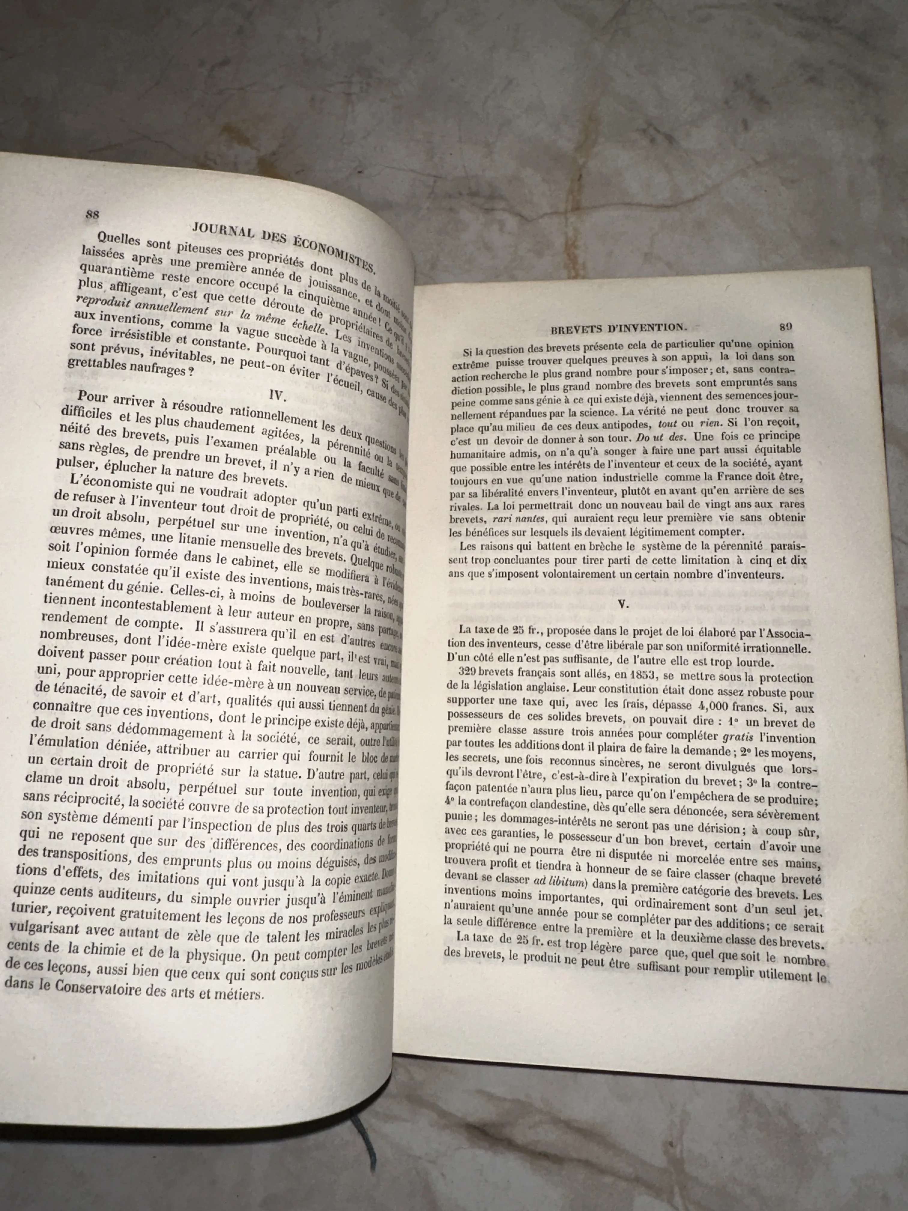 Разворот старинной книги на французском языке со статьей о патентах в экономическом журнале XIX века