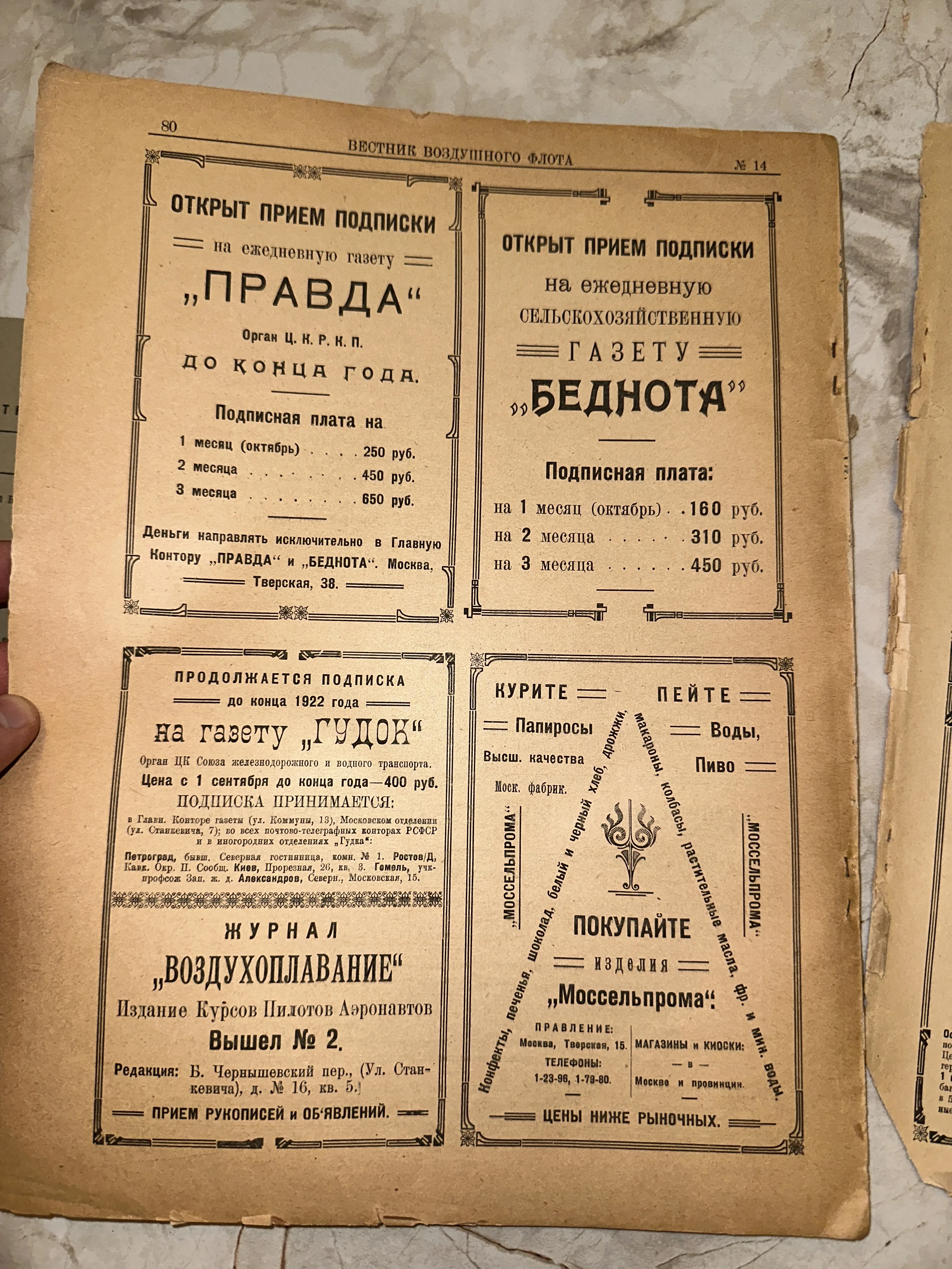 Рекламная страница журнала «Вестник воздушного флота», 1922 год