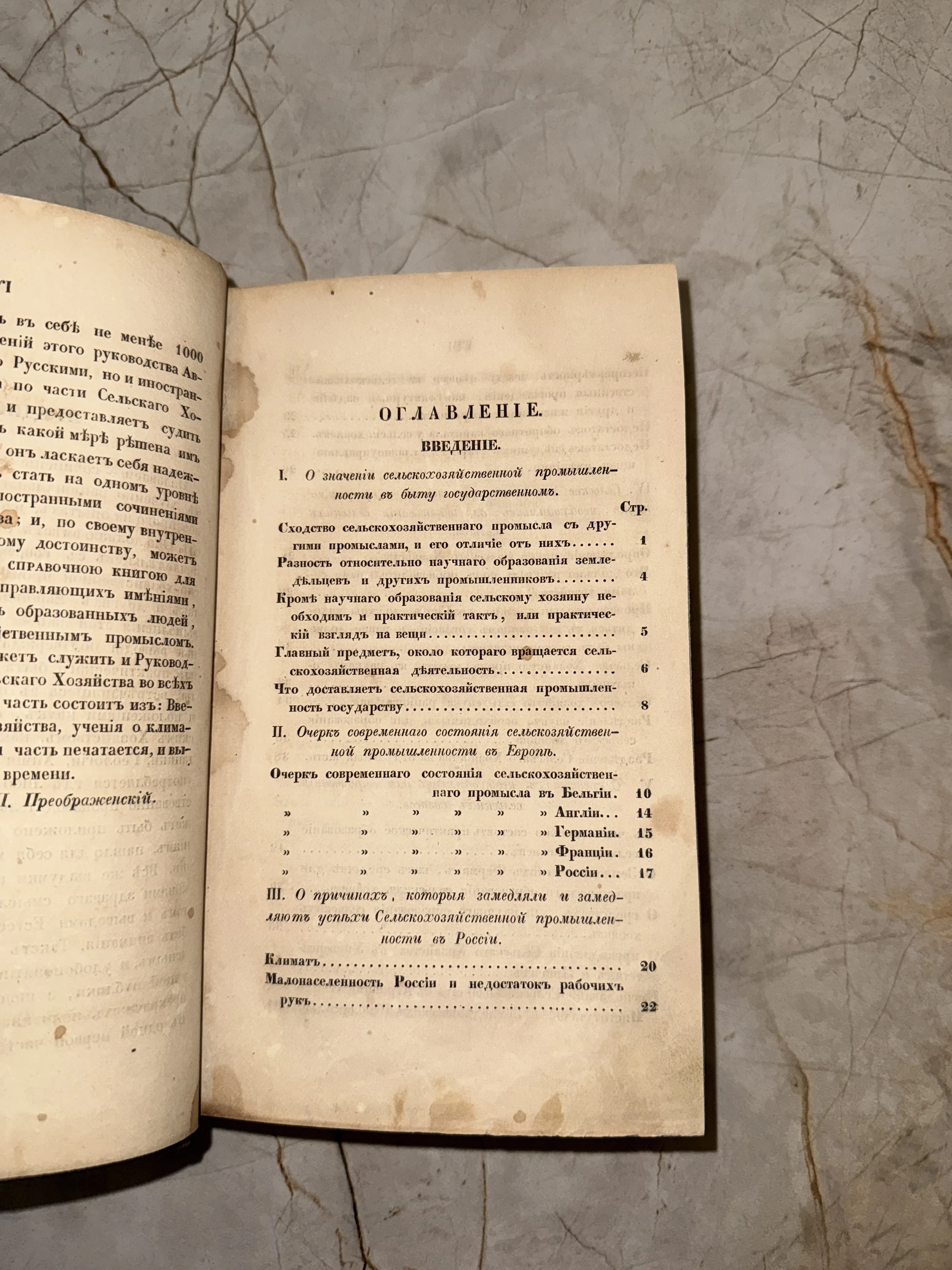 Разворот антикварной книги с оглавлением на русском языке в дореволюционной орфографии, посвященным сельскому хозяйству.