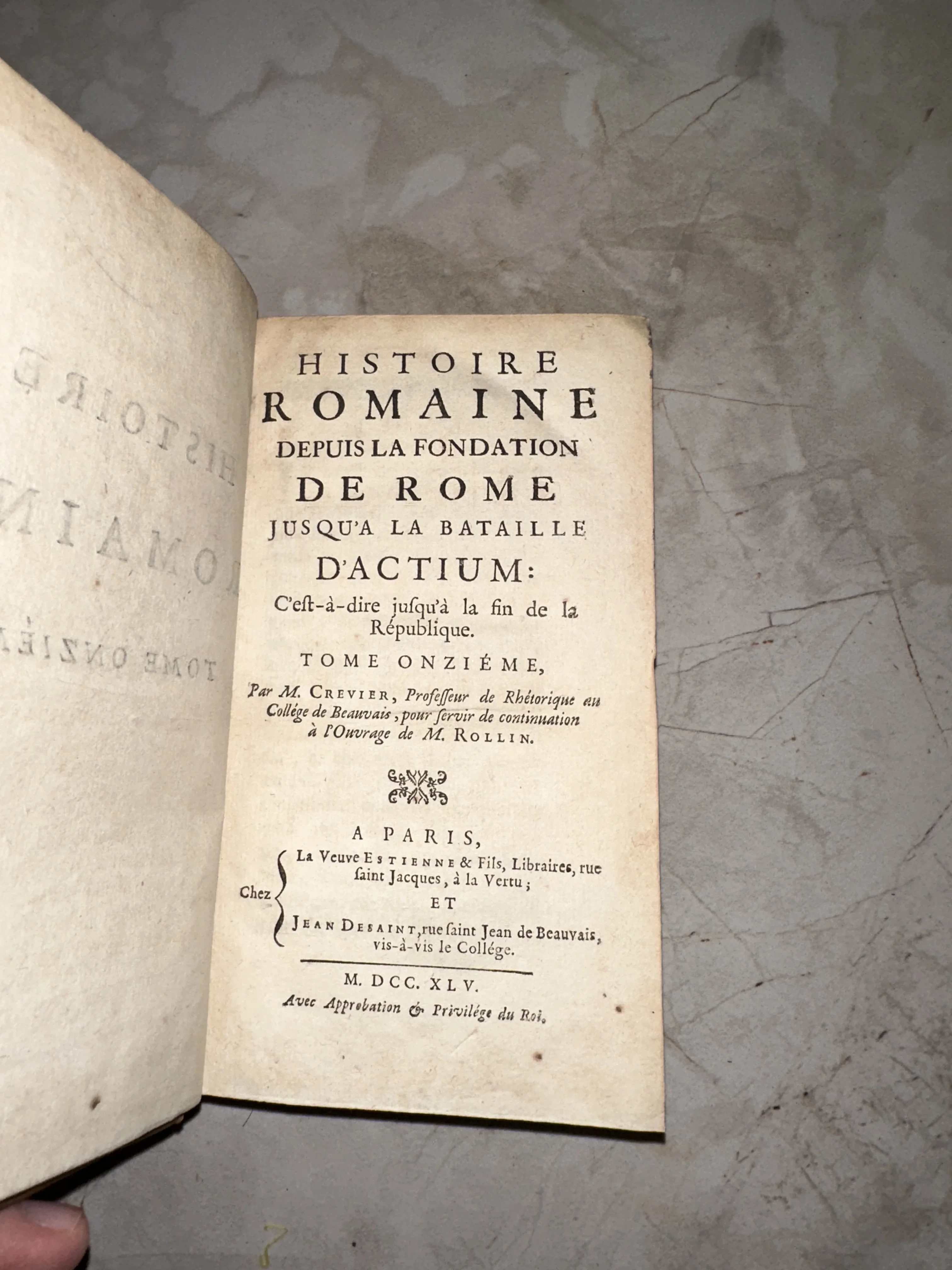 Одиннадцатый том фундаментального труда по истории Древнего Рима, изданный в Париже в эпоху Просвещения. Текст напечатан на благородной бумаге верже, сохранившей свою фактуру и характерное пожелтение, что подчеркивает почтенный возраст и подлинность этого коллекционного экземпляра.