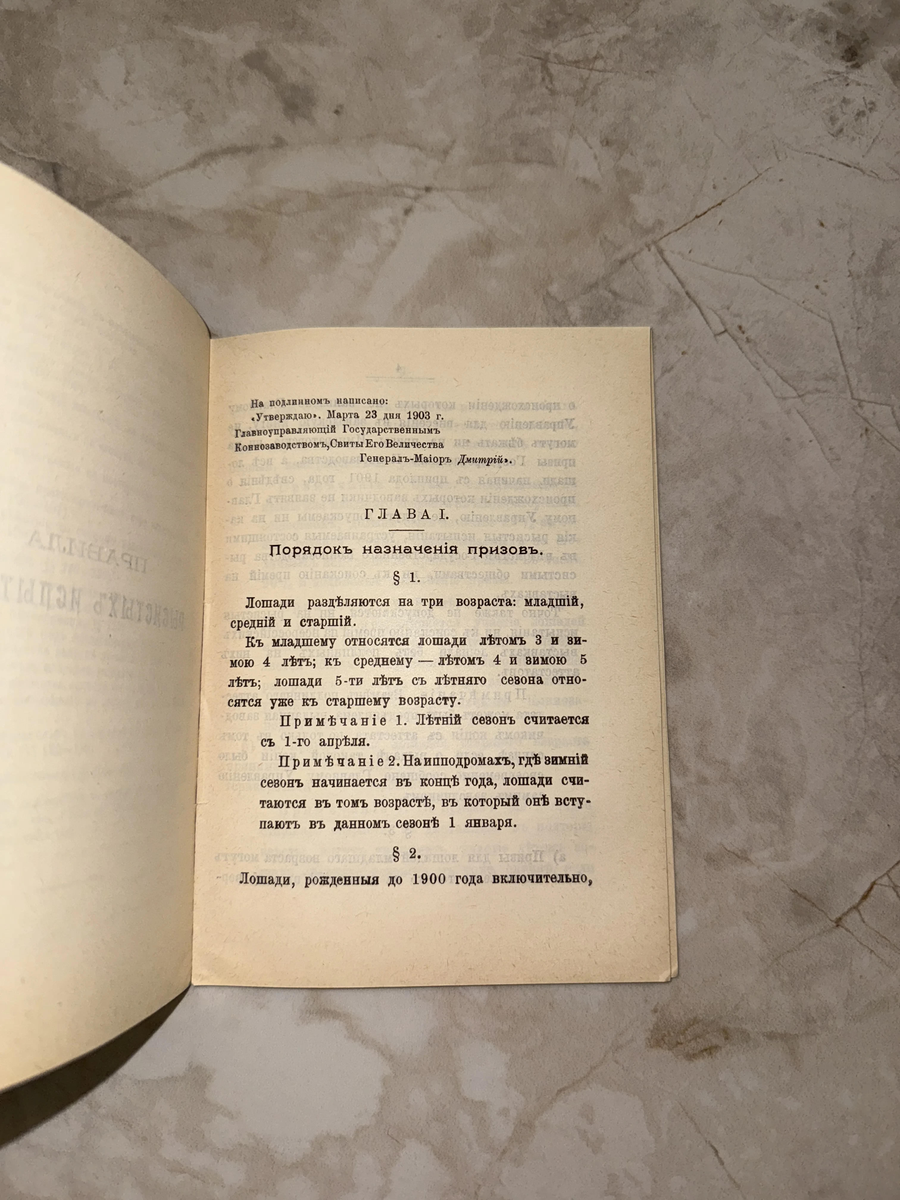 Разворот антикварной книги с дореволюционным шрифтом, глава первая о порядке назначения призов для лошадей.