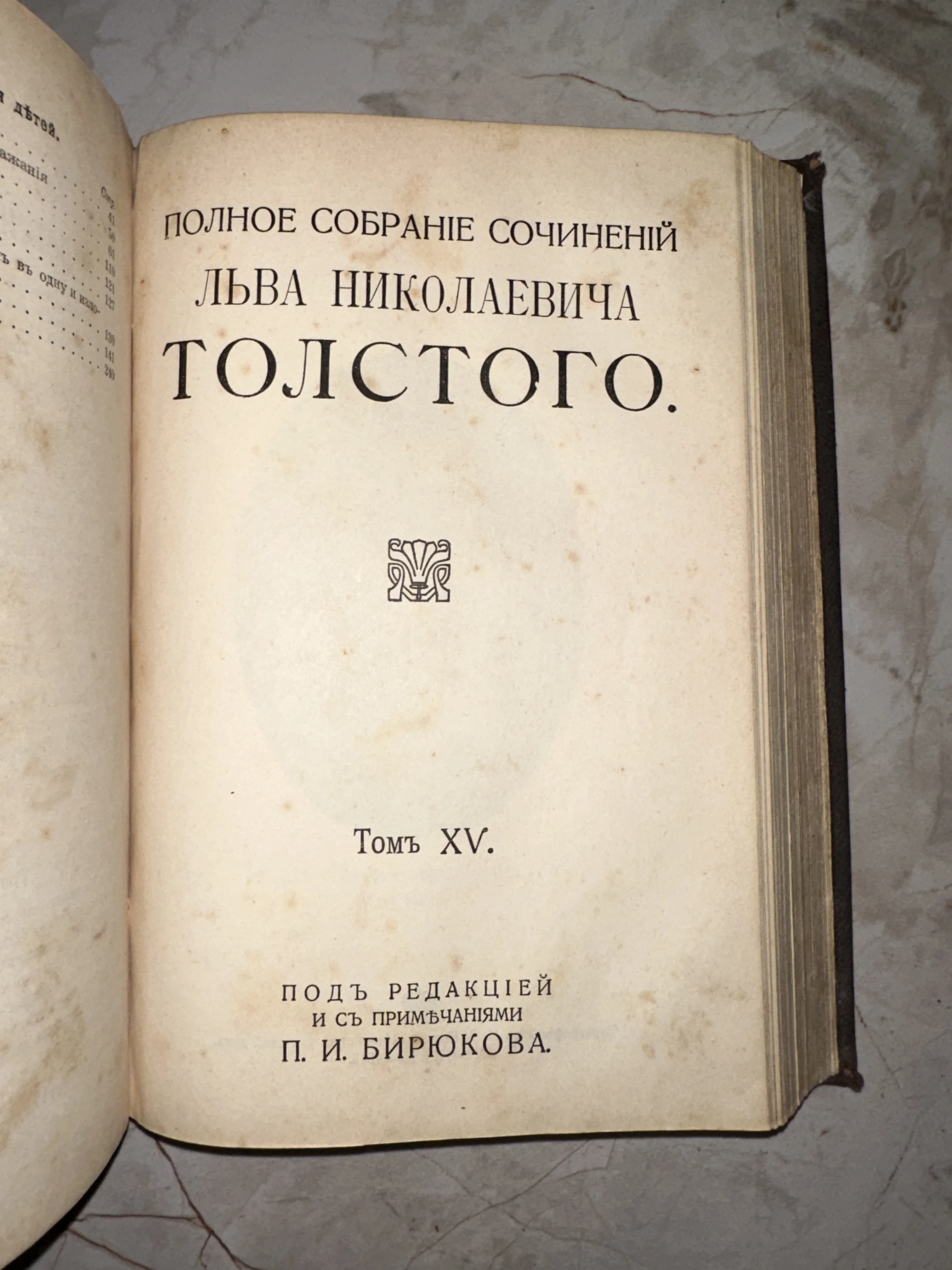 Титульный лист антикварной книги Льва Николаевича Толстого, том пятнадцатый, под редакцией П. И. Бирюкова.