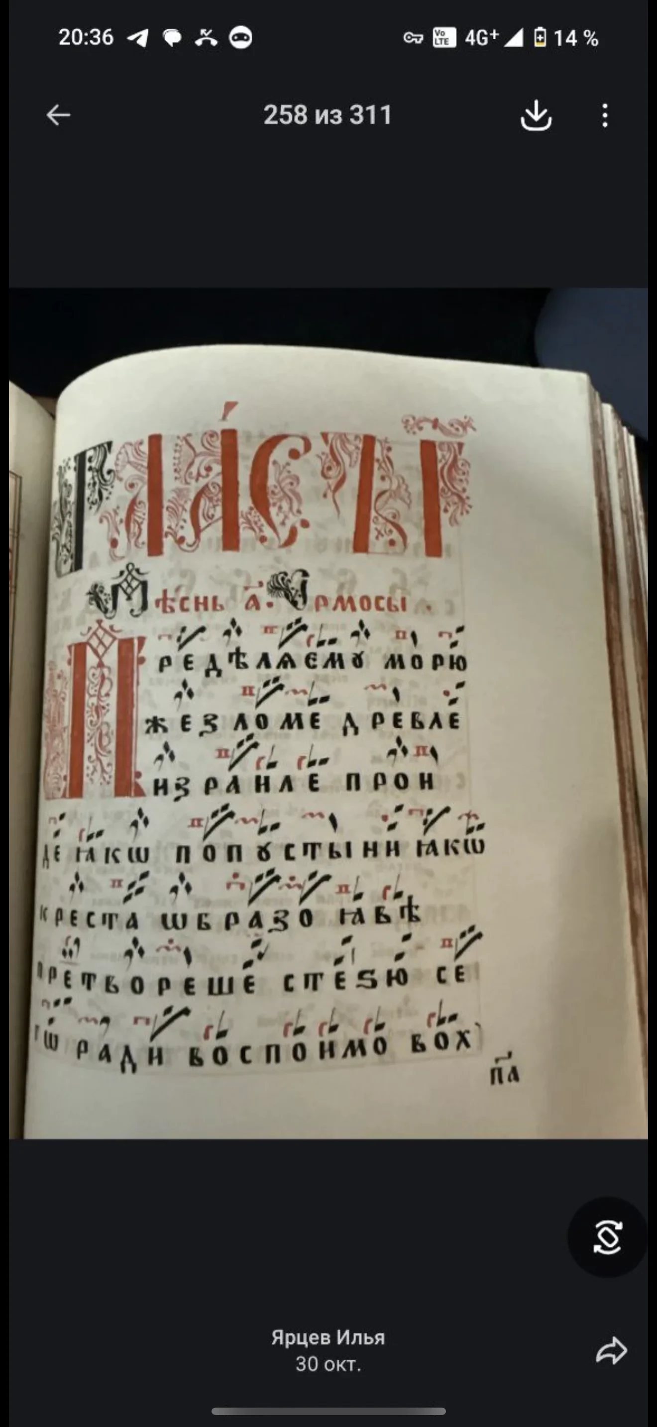 Страница старинной церковной книги с текстом на церковнославянском языке и крюковыми нотами для пения.