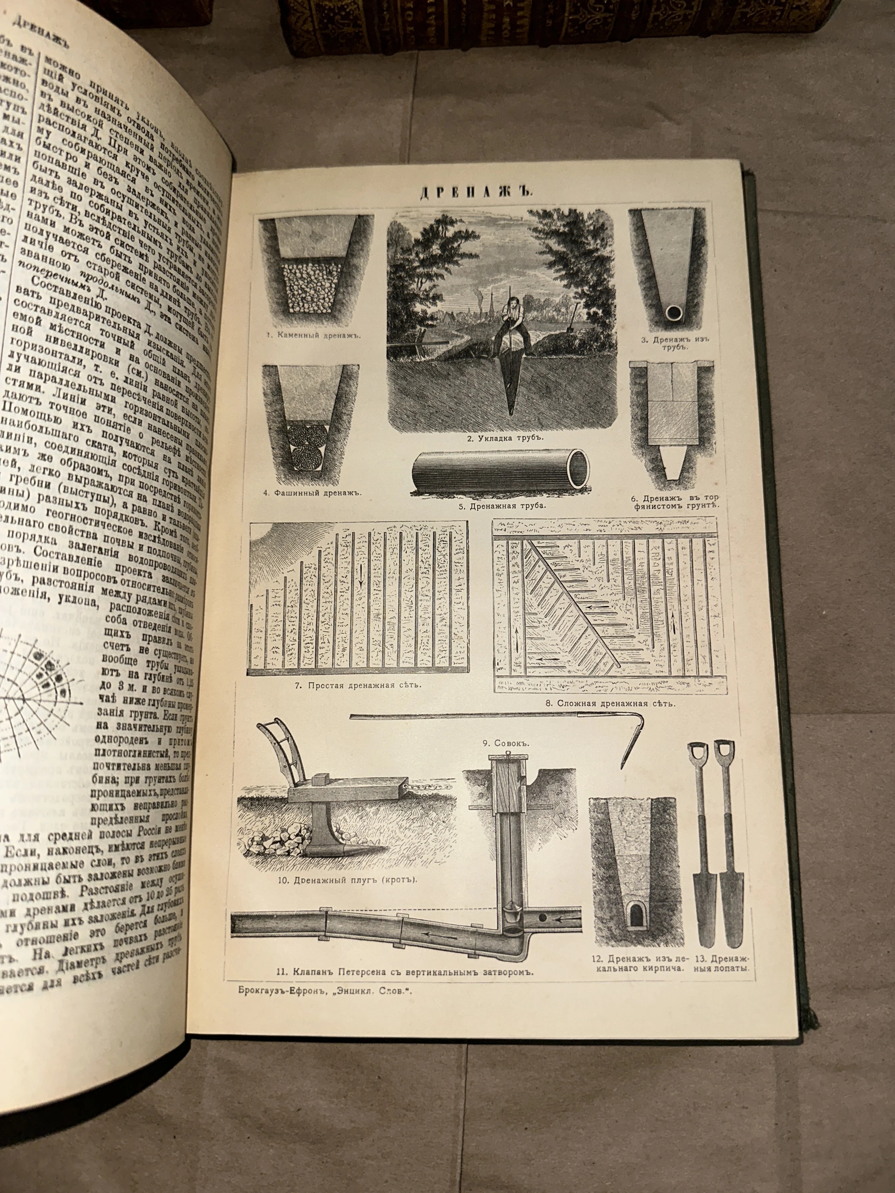 Страница антикварной книги с заголовком «Дренажъ» и чертежами дренажных систем, труб и инструментов из Энциклопедического словаря Брокгауза и Ефрона.