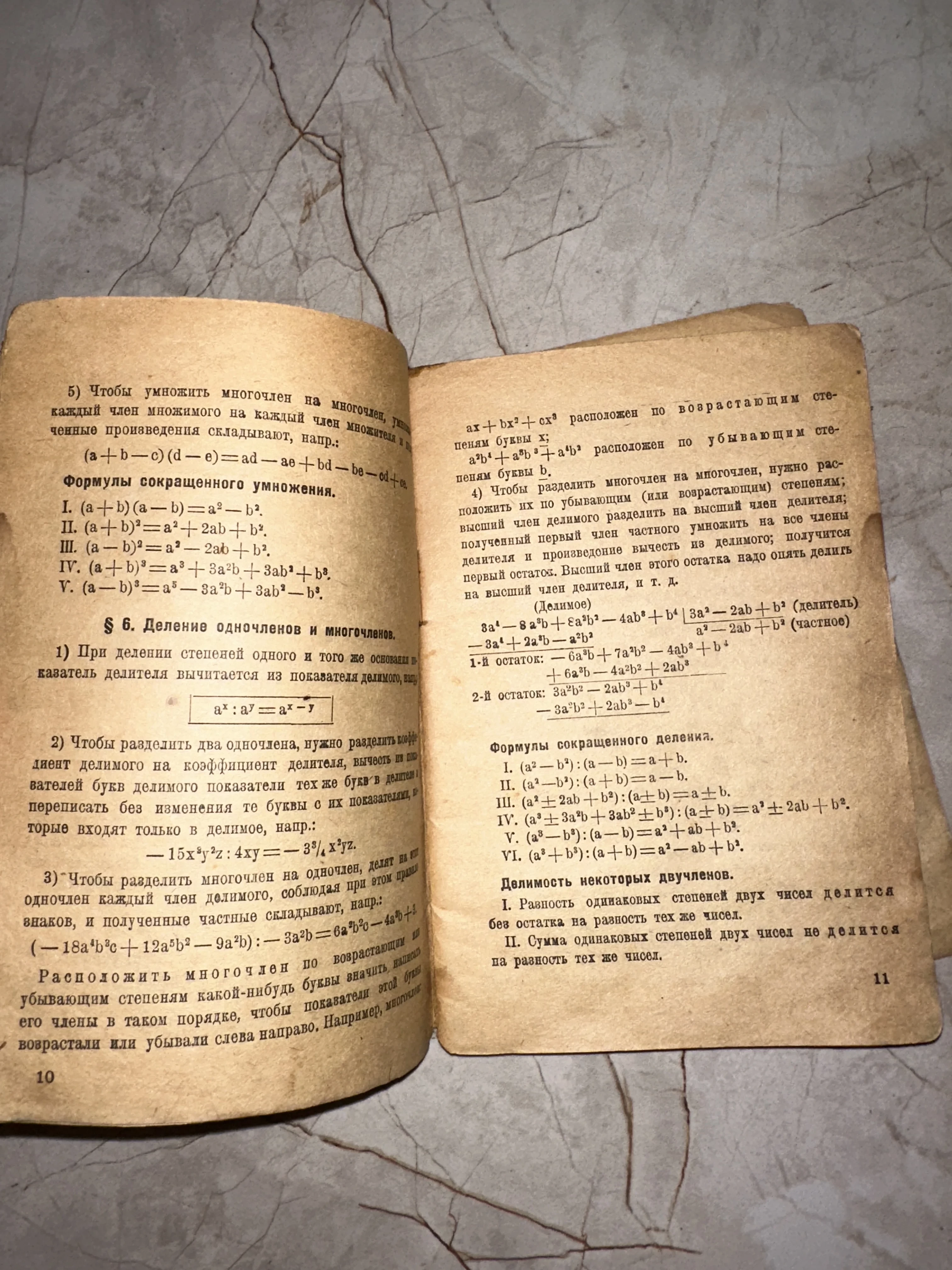 Этот аутентичный разворот старого учебника алгебры хранит в себе эстетику академической строгости прошлых лет. Пожелтевшие от времени страницы с четкой классической типографикой и формулами создают особую ностальгическую атмосферу научного поиска. Идеальный предмет для оформления тематических интерьеров или пополнения коллекции винтажной учебной литературы.