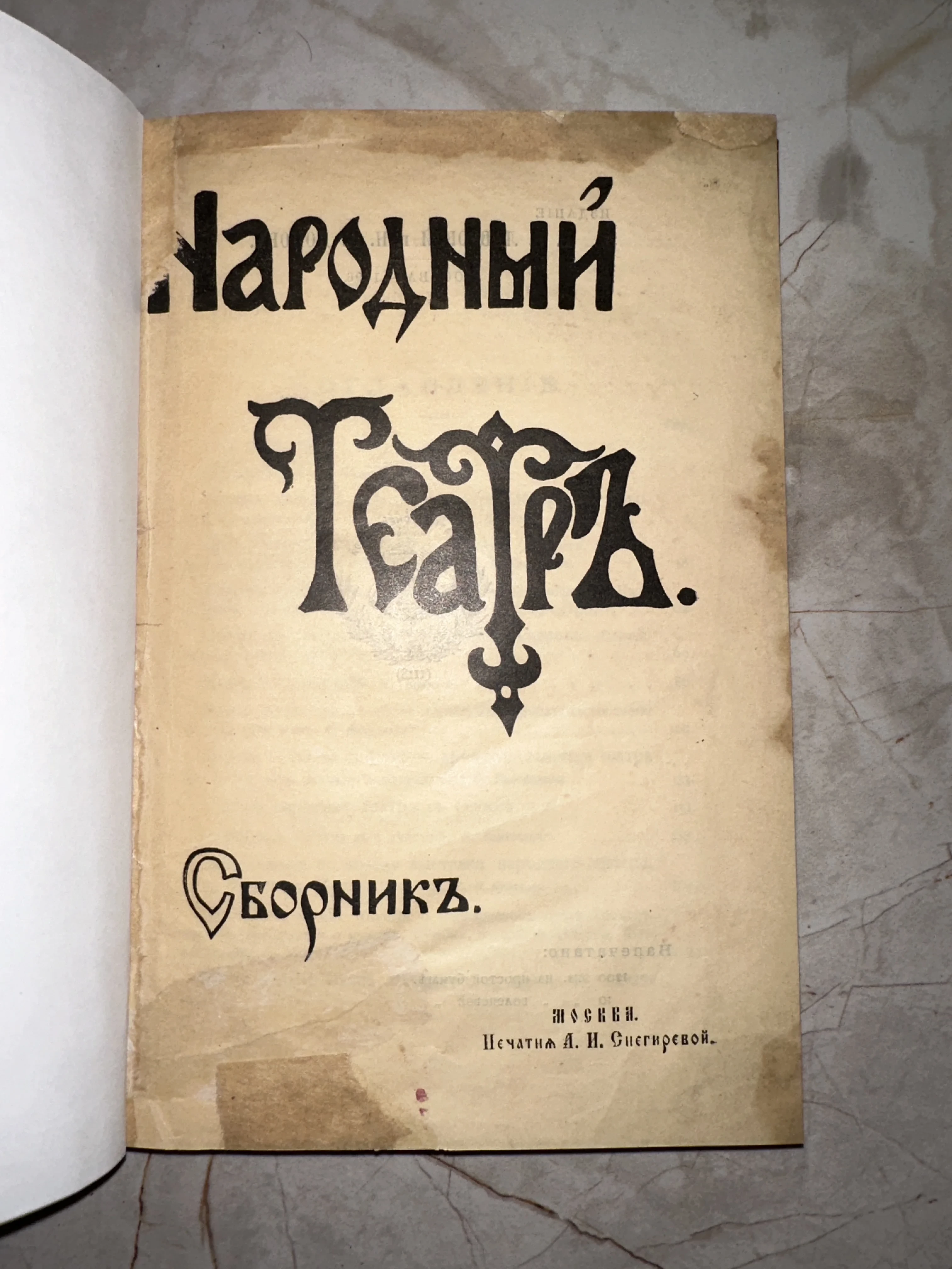 Уникальное театральное издание, отпечатанное в знаменитой московской типографии А. И. Снегиревой. Изящная дореволюционная орфография и стилизованный заголовок подчеркивают историческую ценность книги, а характерные следы времени на бумаге лишь добавляют предмету антикварного шарма. Идеальный экземпляр для ценителей истории русского театра и книжного искусства начала XX века.
