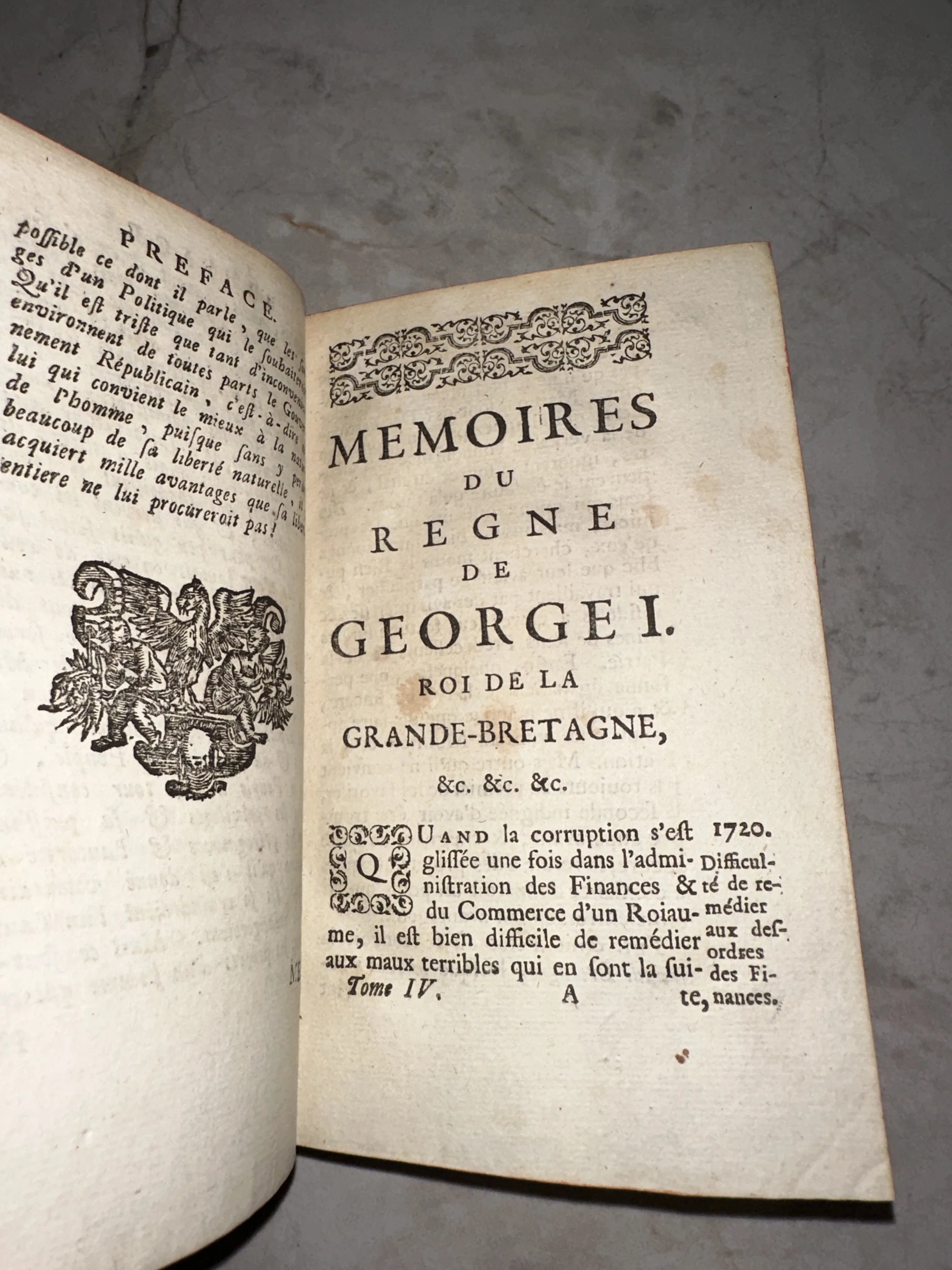 Разворот антикварной книги на французском языке с заголовком Memoires du Regne de George I и гравированной виньеткой.
