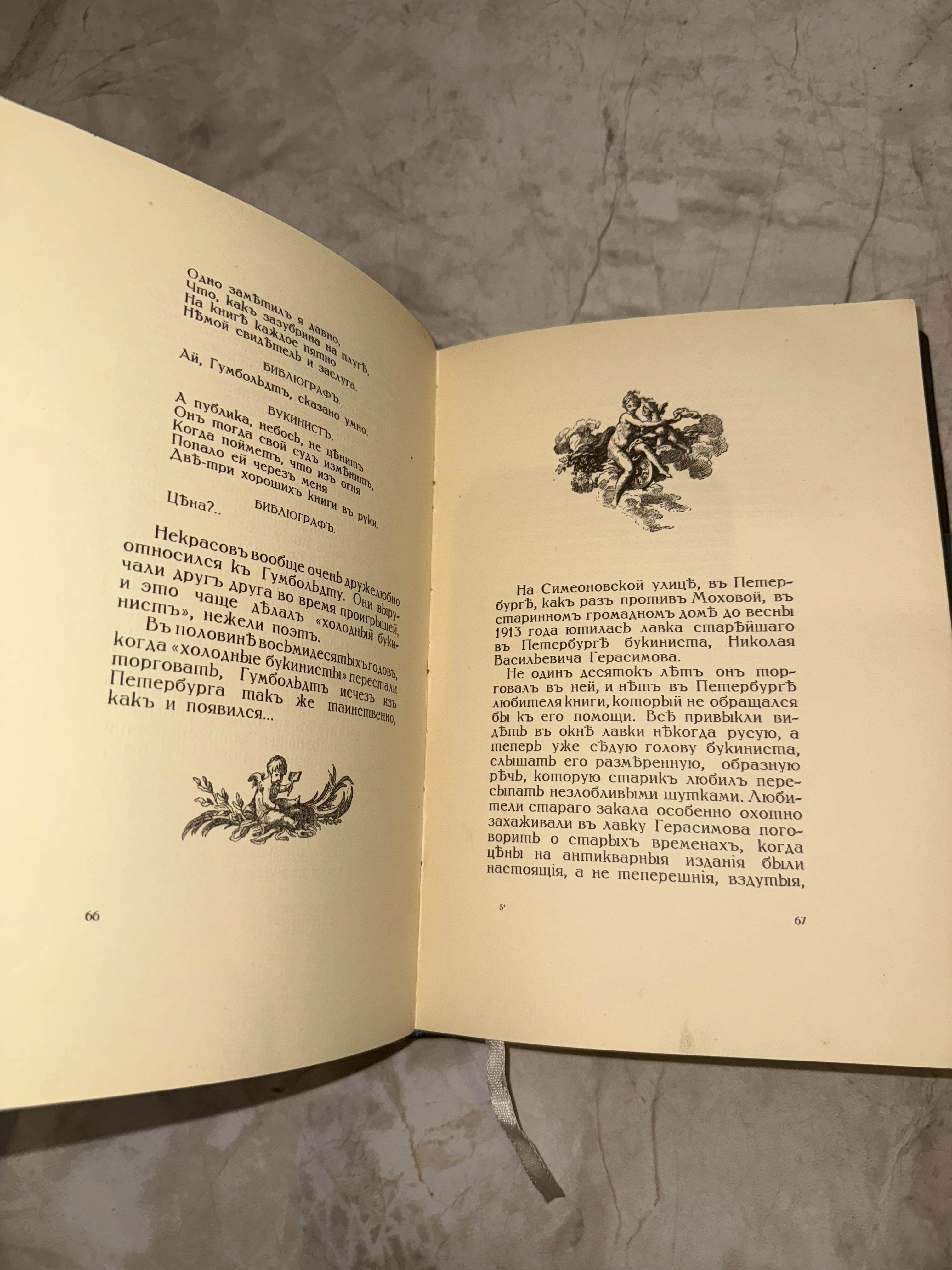 Разворот старинной книги с текстом на дореволюционном русском языке и декоративными виньетками с изображением херувимов.